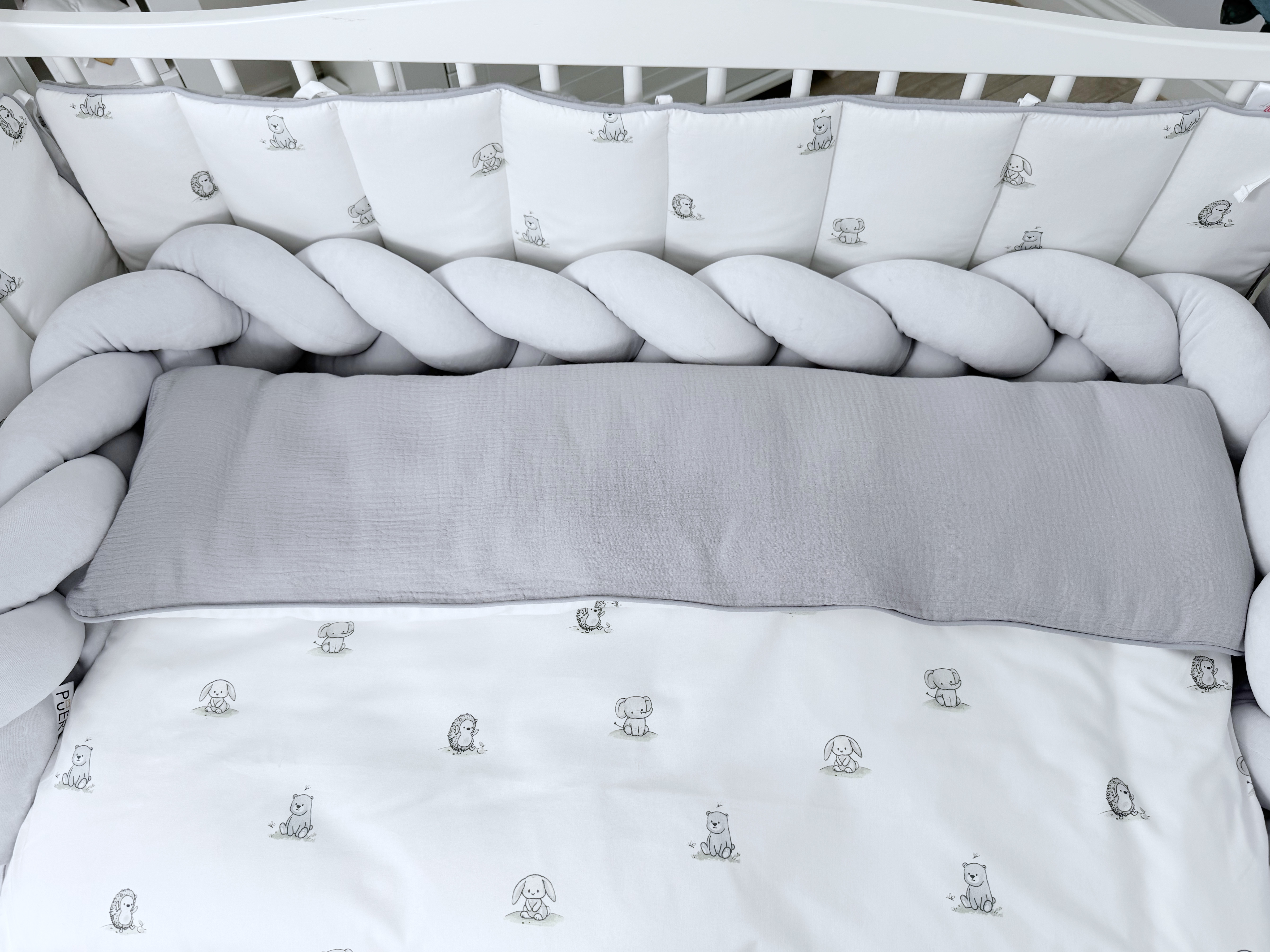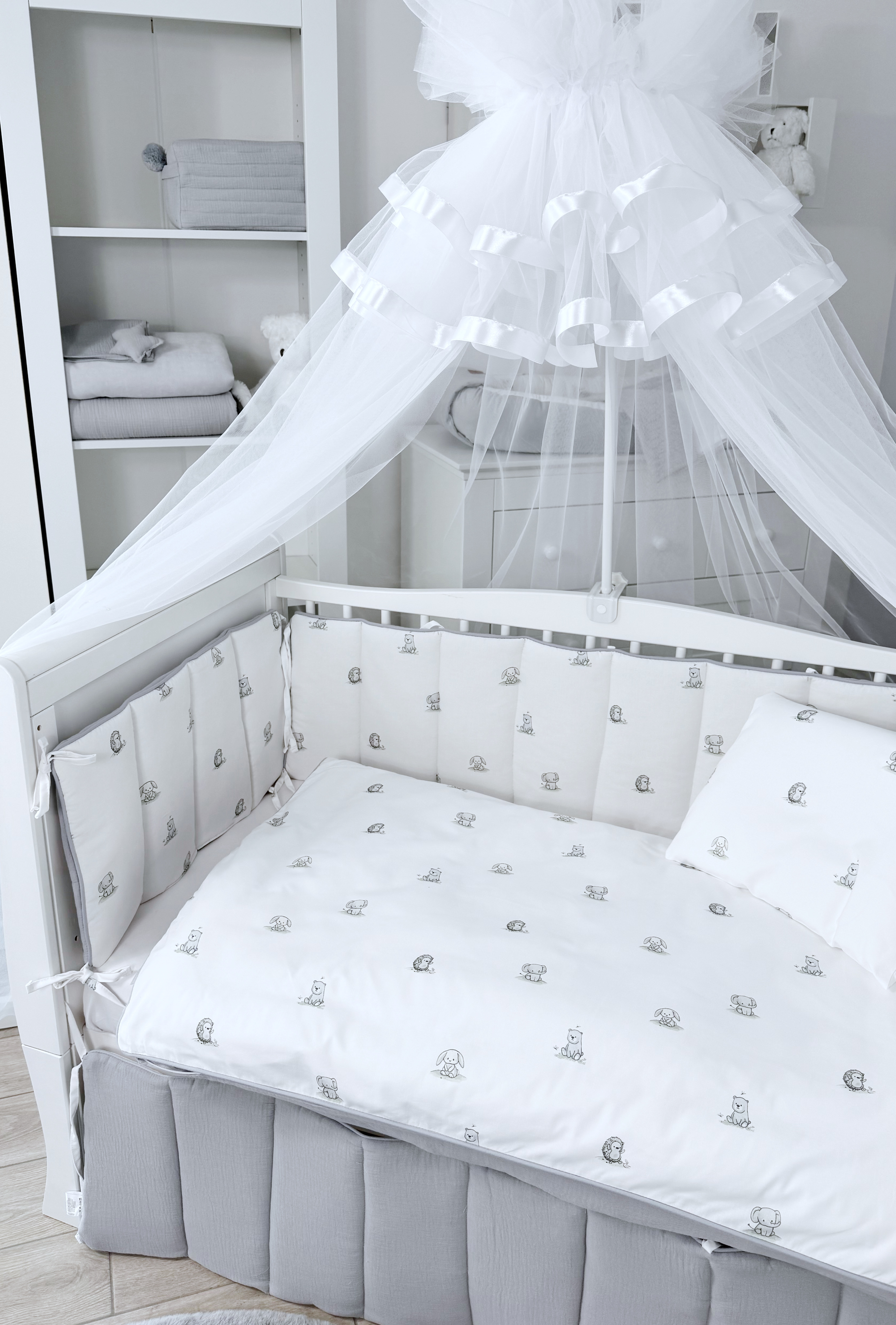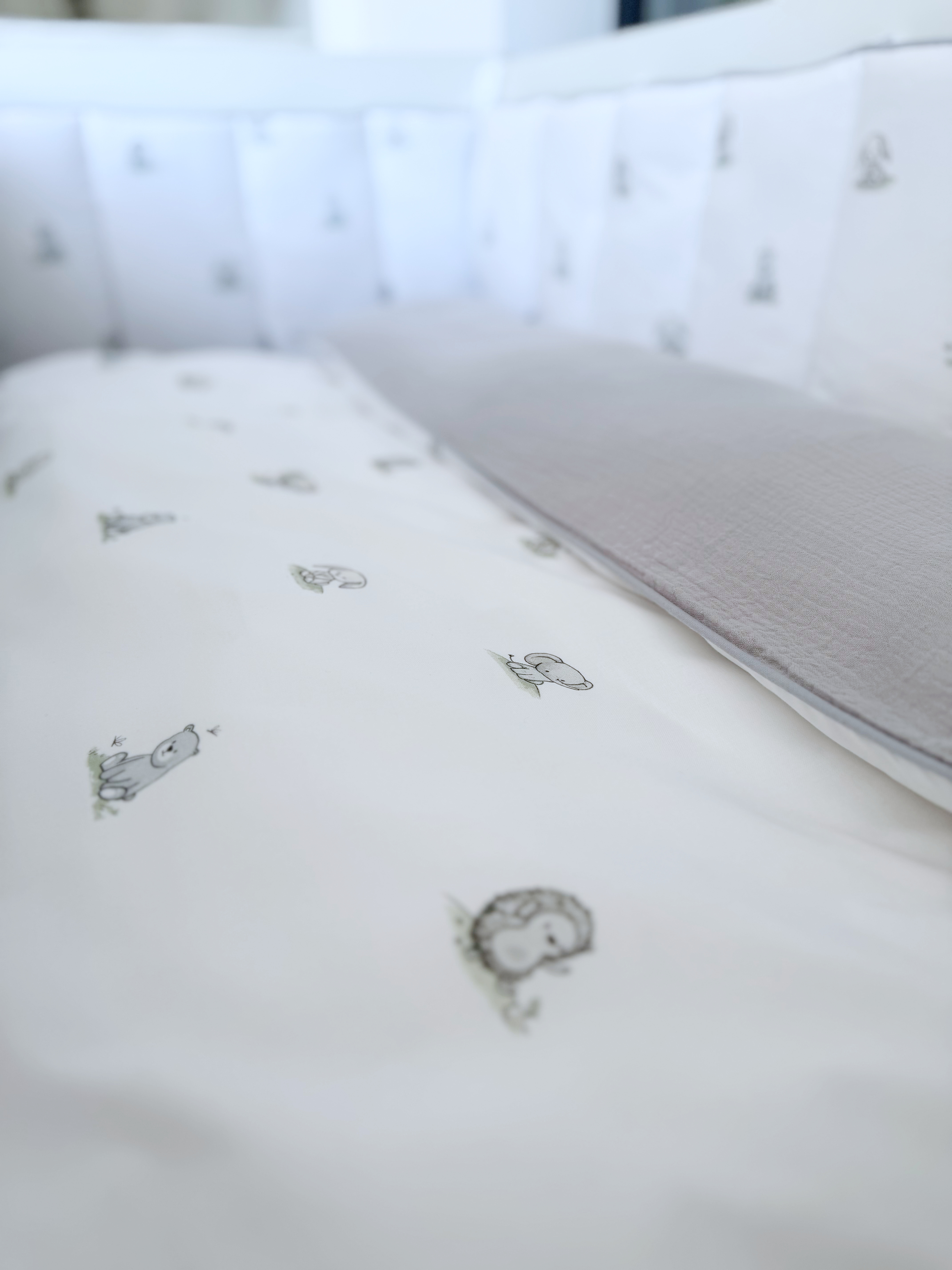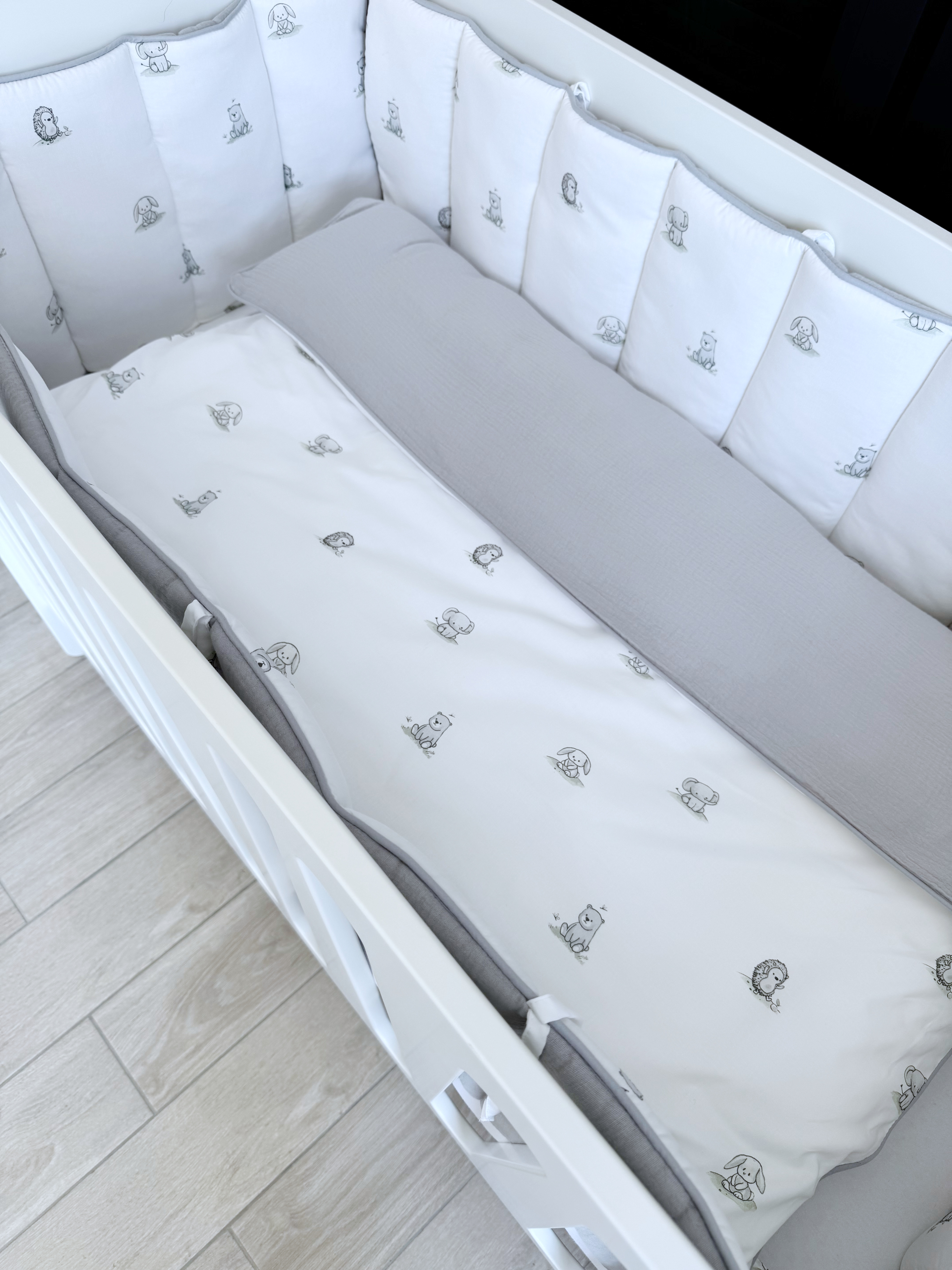Комплект постельного белья New Animals, 6 предметов (125*65 пододеяльник+одеяло, наволочка+подушка, простыня на резинке, борт 30 см, 4 части), цвет белый/серый, Lepre
