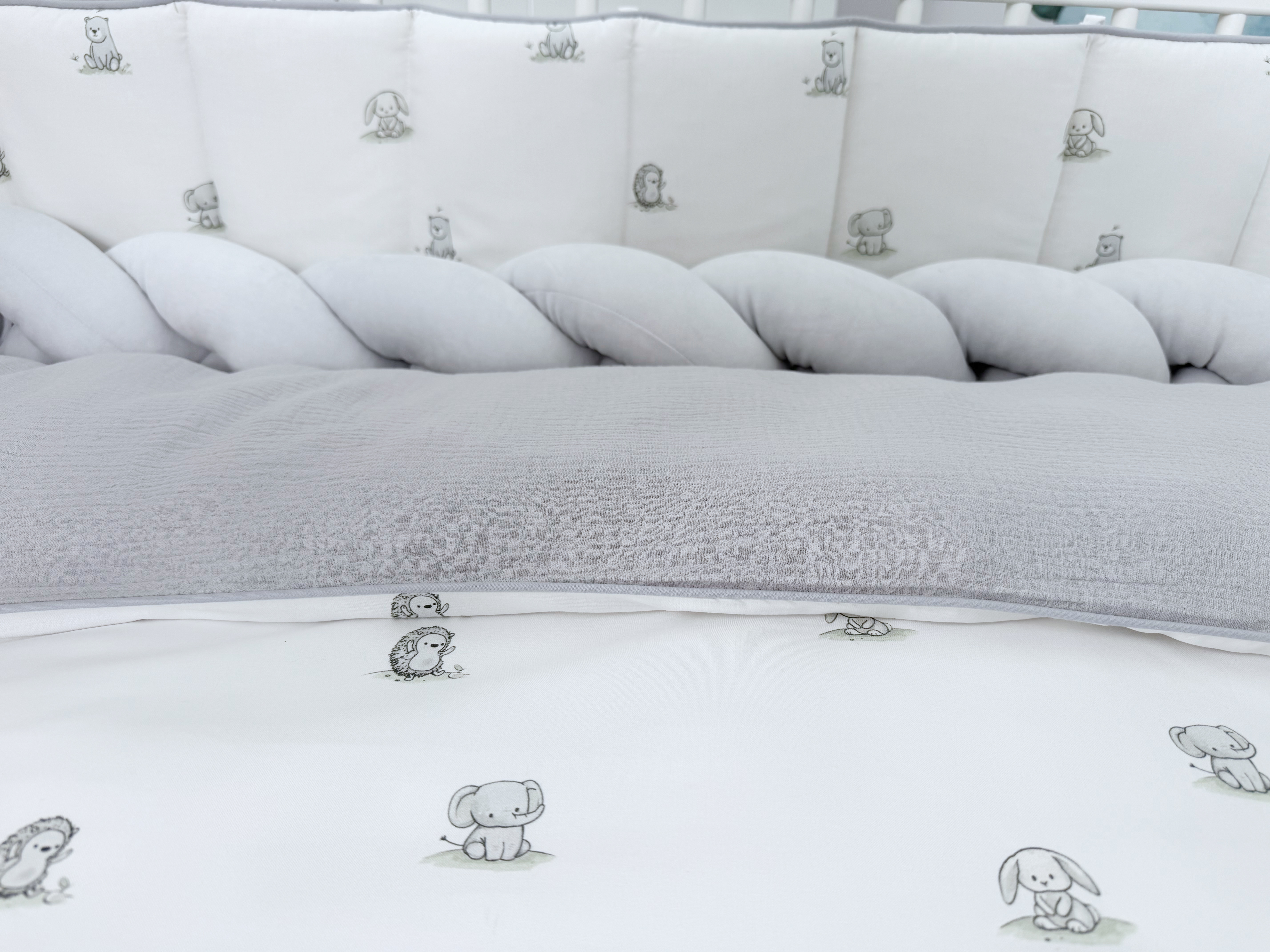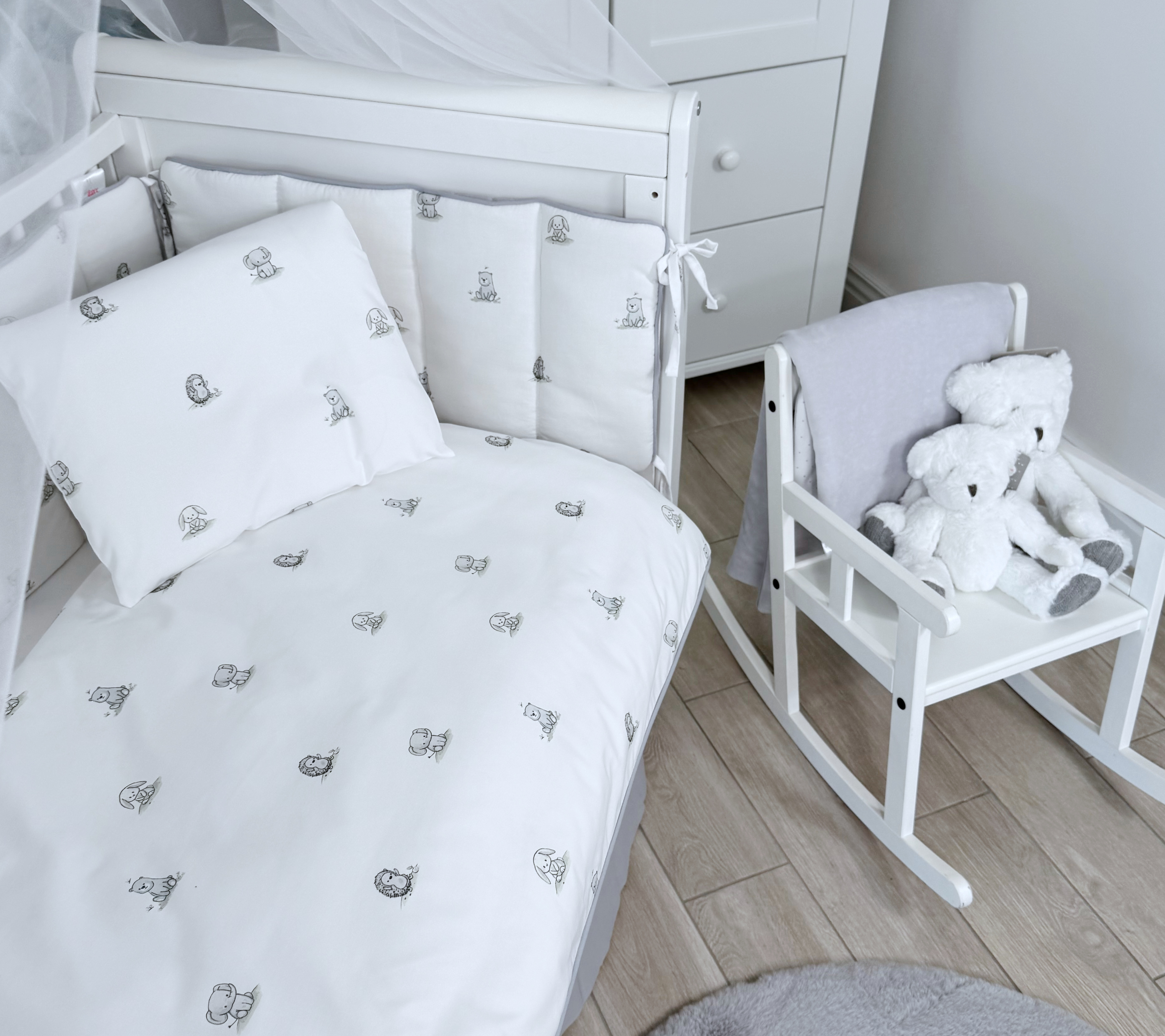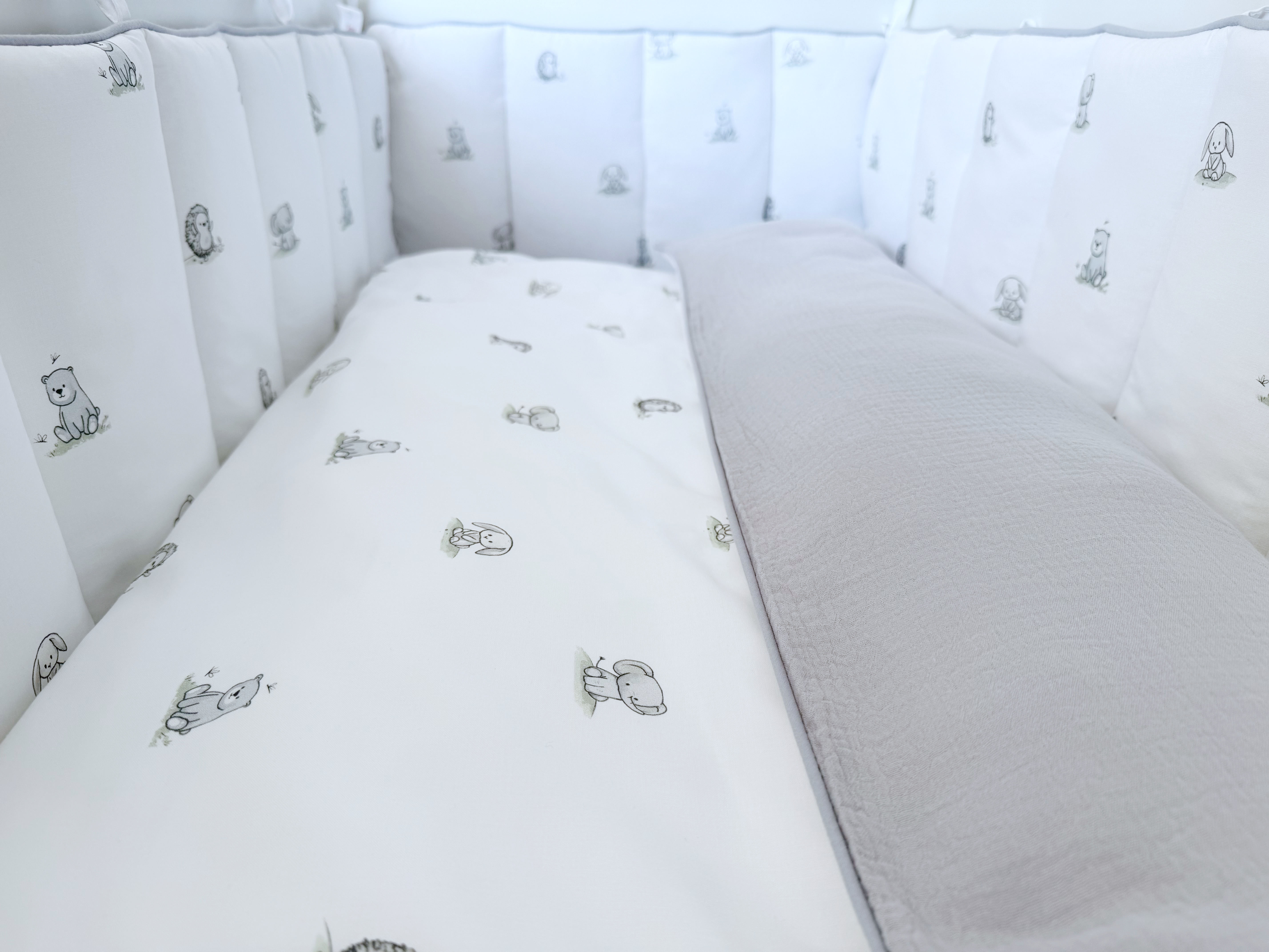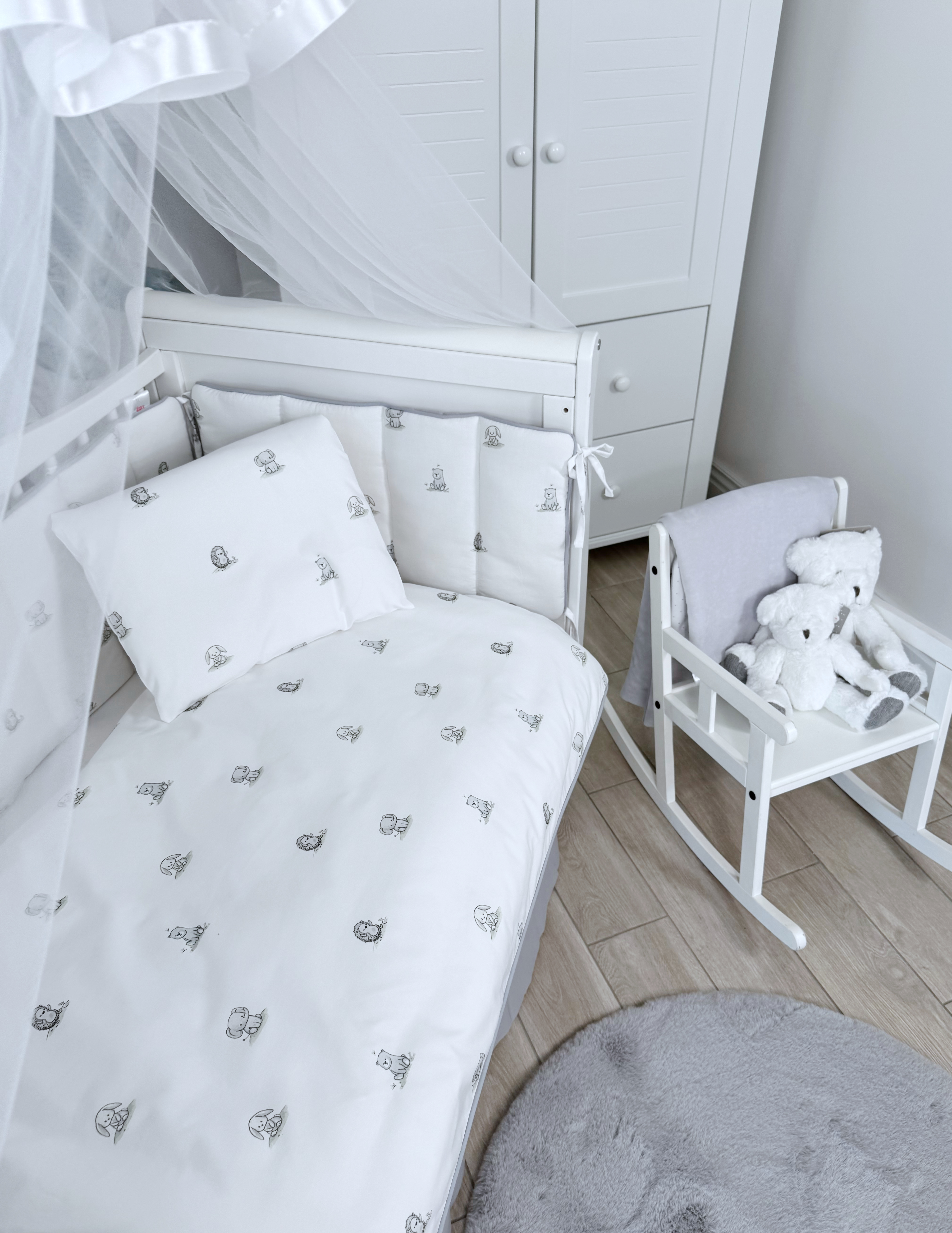 Комплект постельного белья New Animals, 6 предметов (125*65 пододеяльник+одеяло, наволочка+подушка, простыня на резинке, борт 30 см, 4 части), цвет белый/серый, Lepre