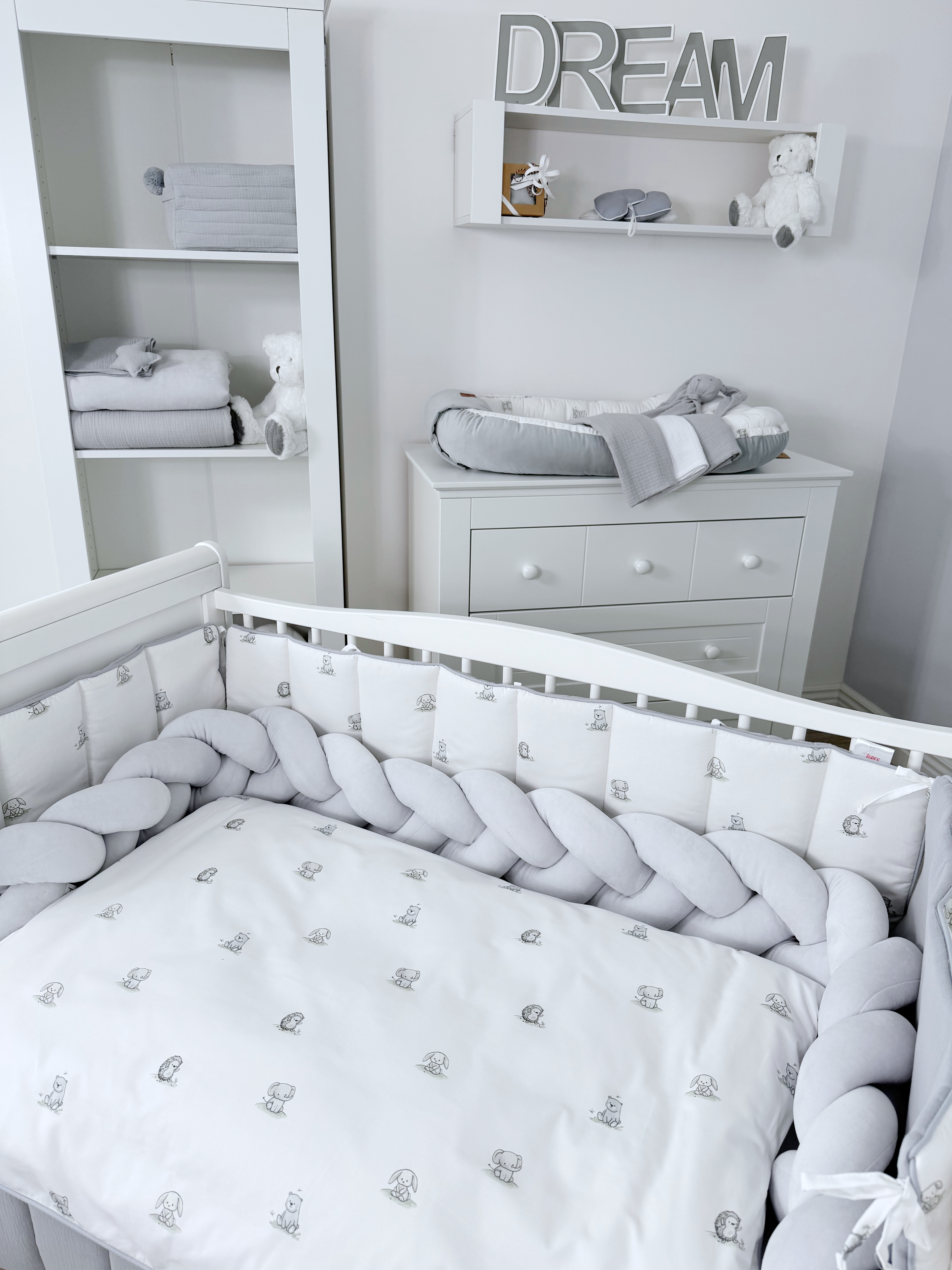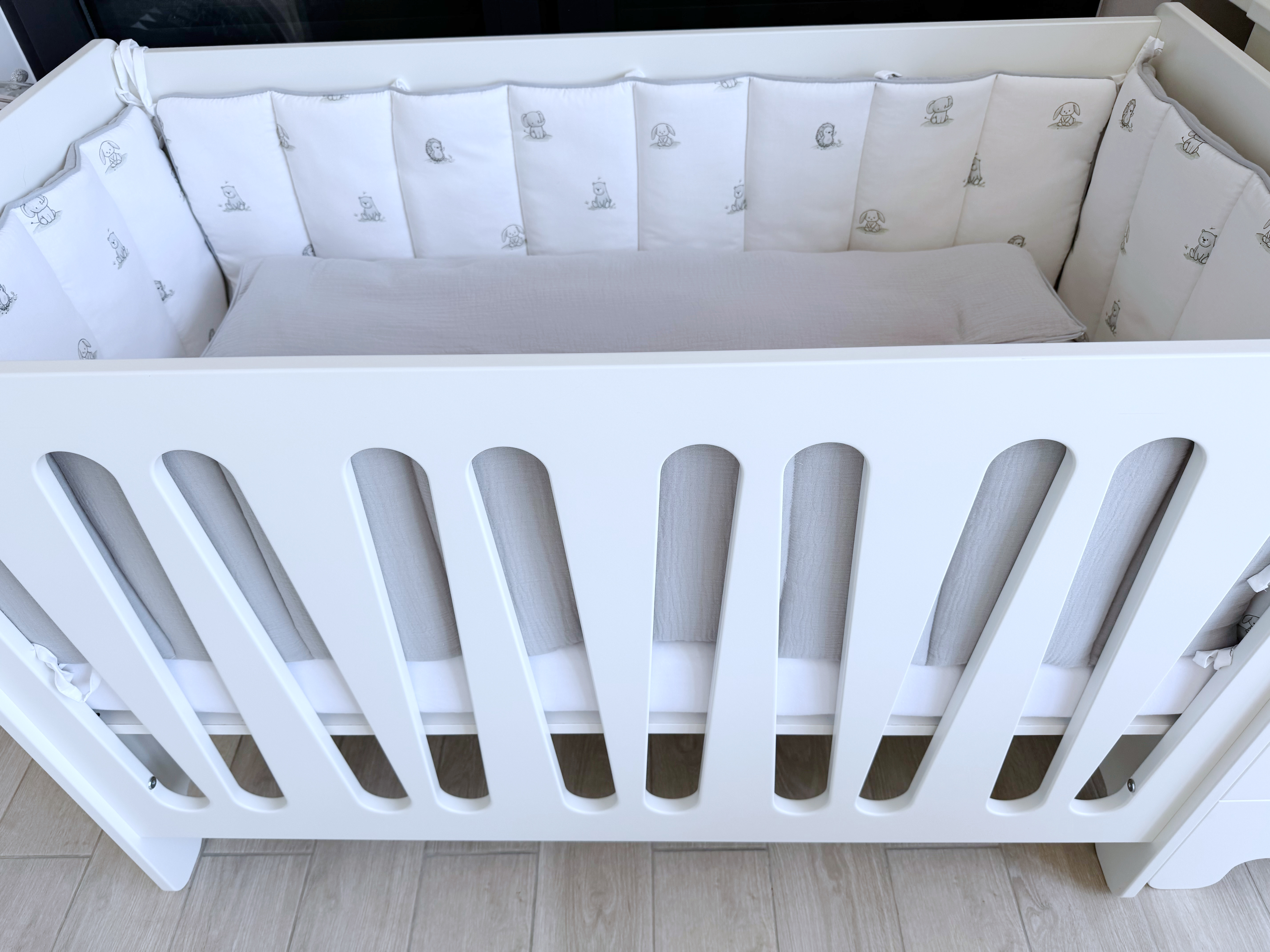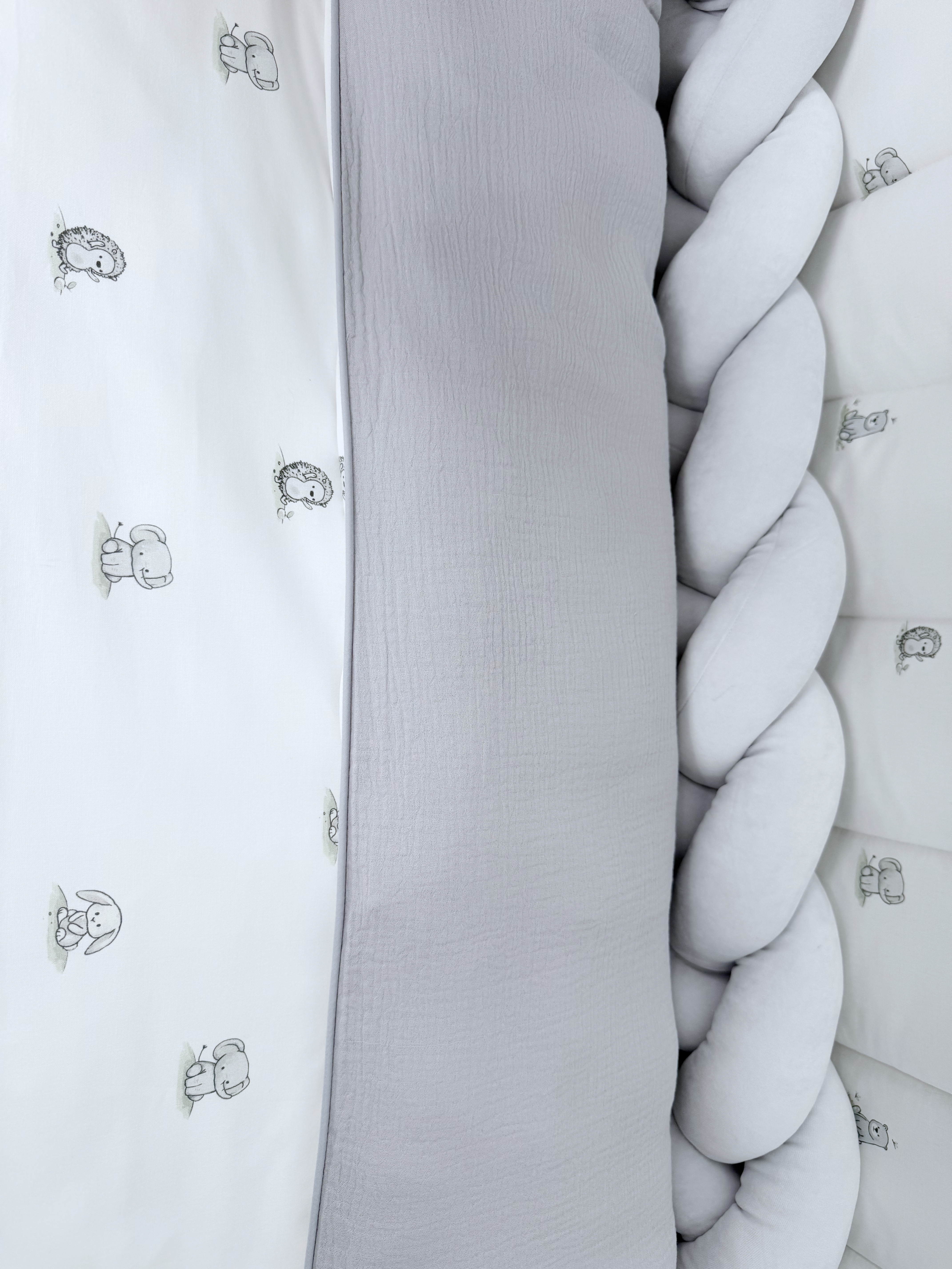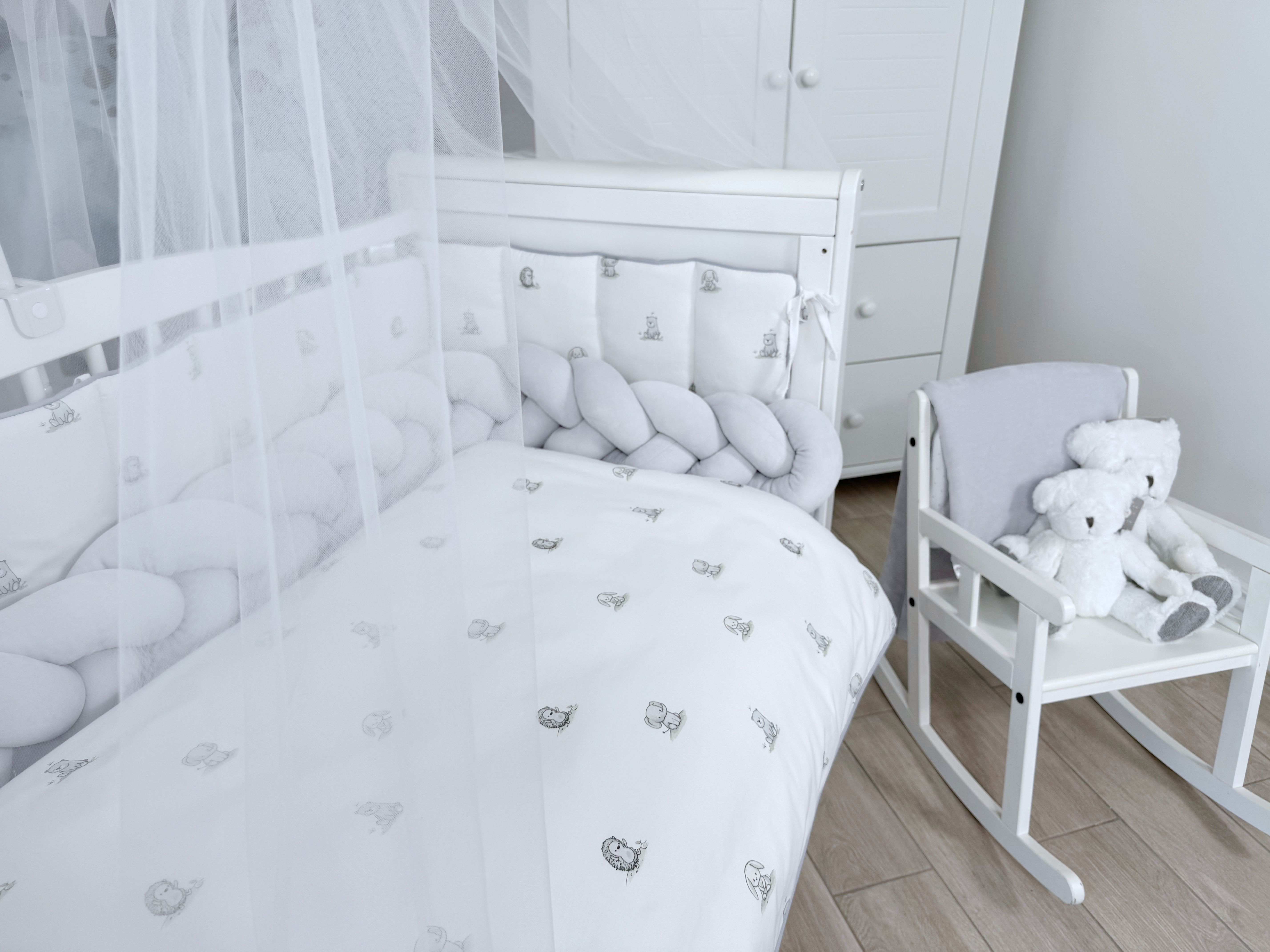 Комплект постельного белья New Animals, 6 предметов (125*65 пододеяльник+одеяло, наволочка+подушка, простыня на резинке, борт 30 см, 4 части), цвет белый/серый, Lepre