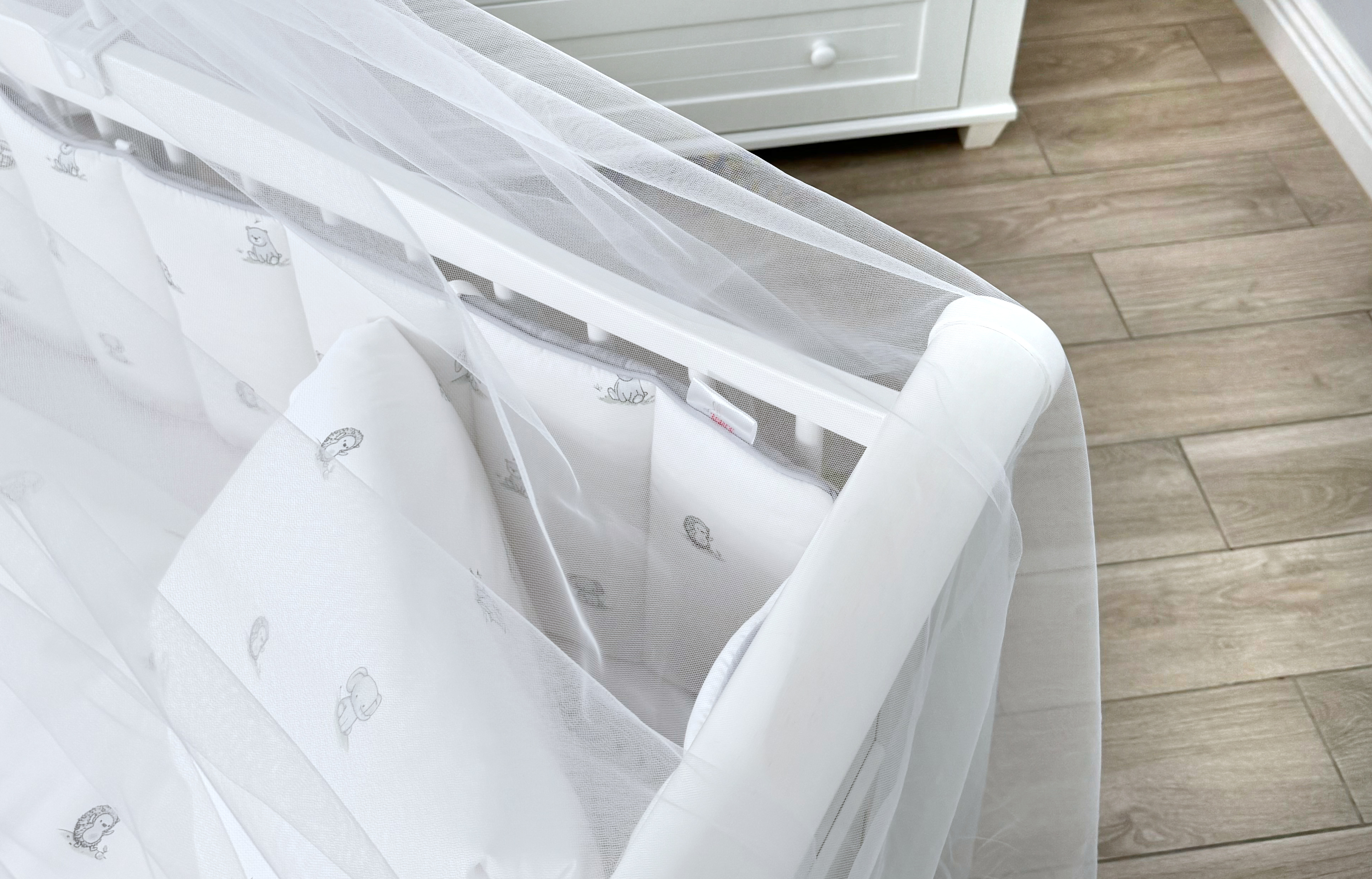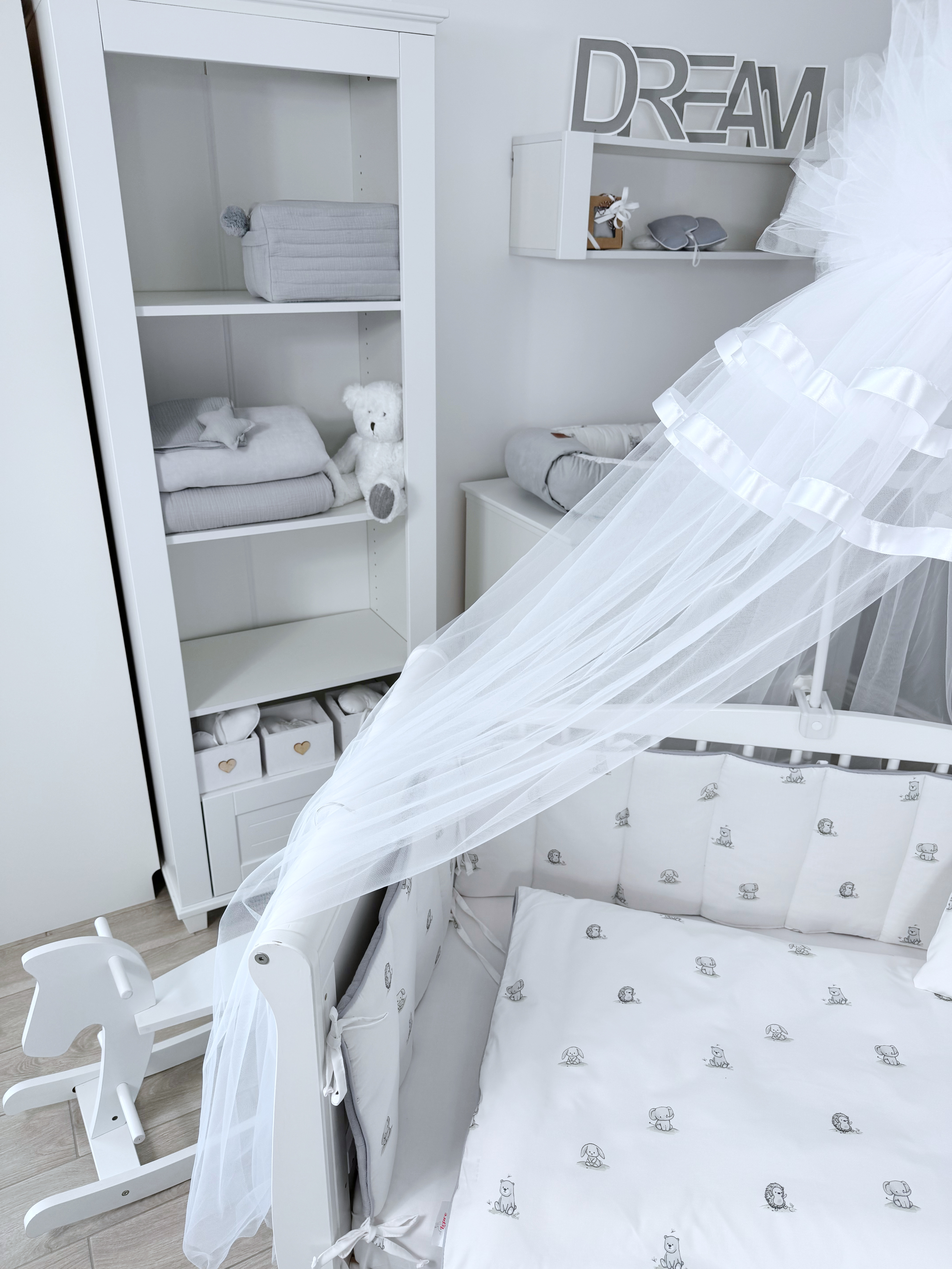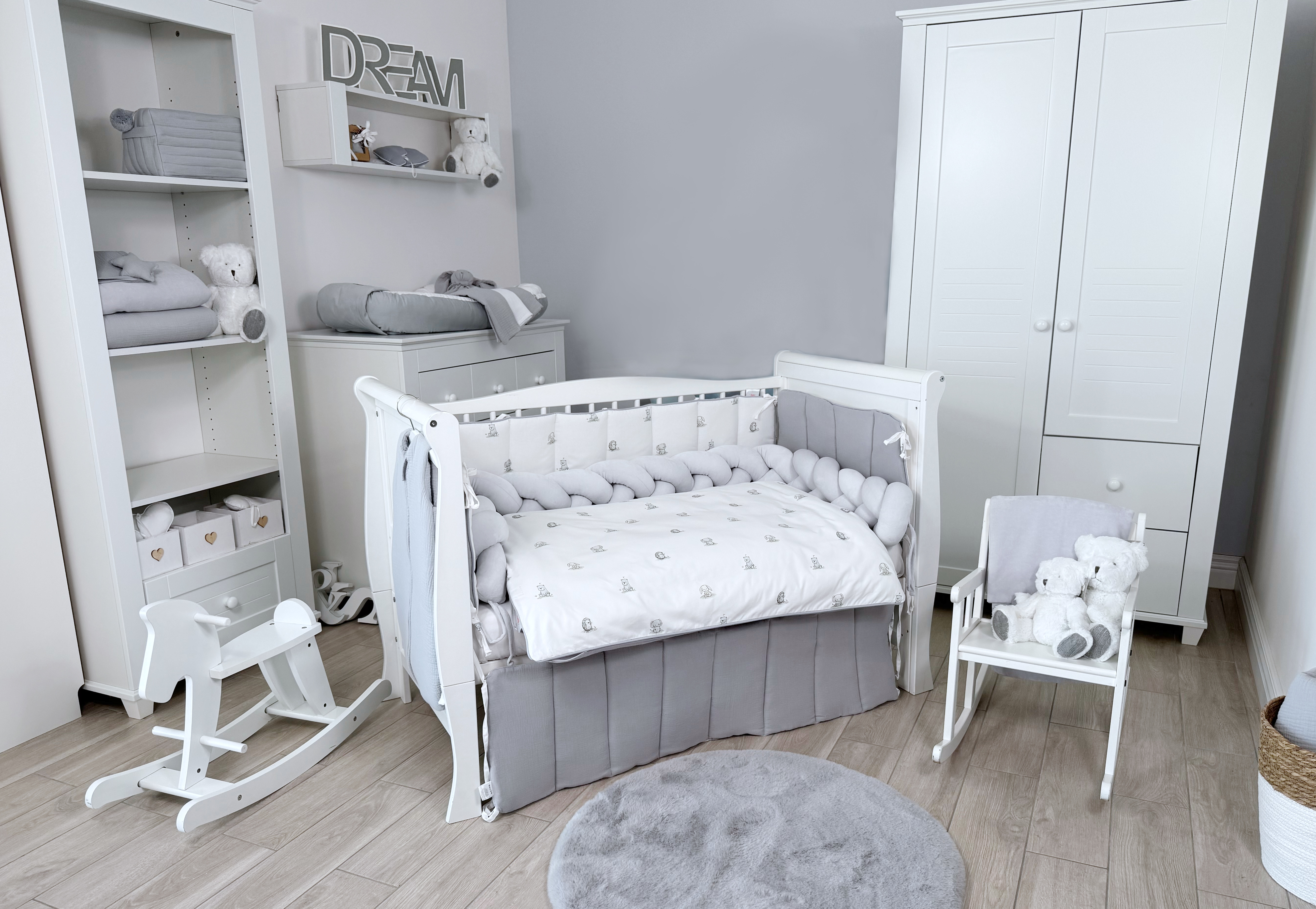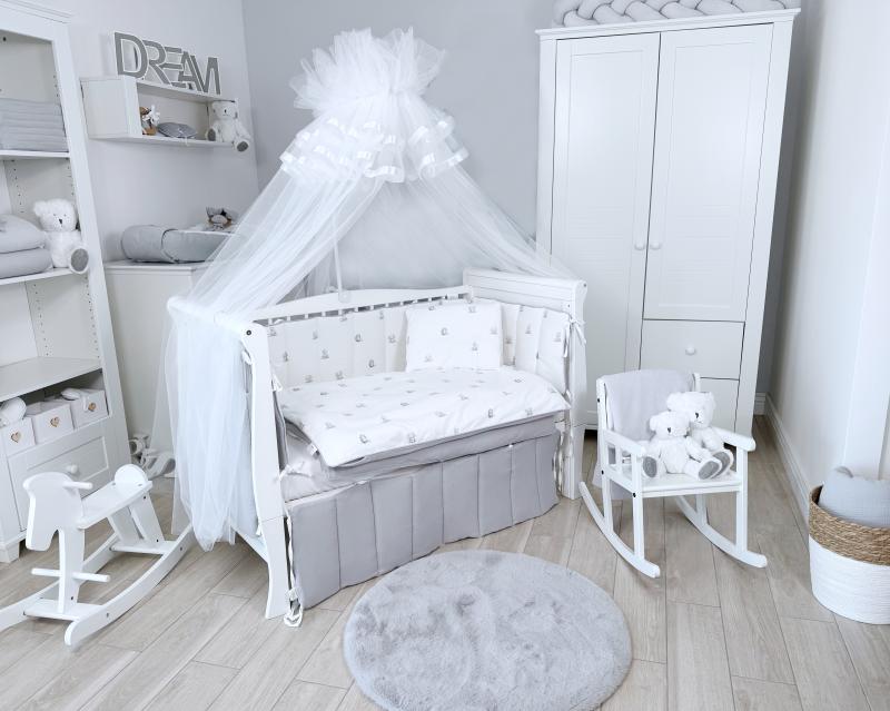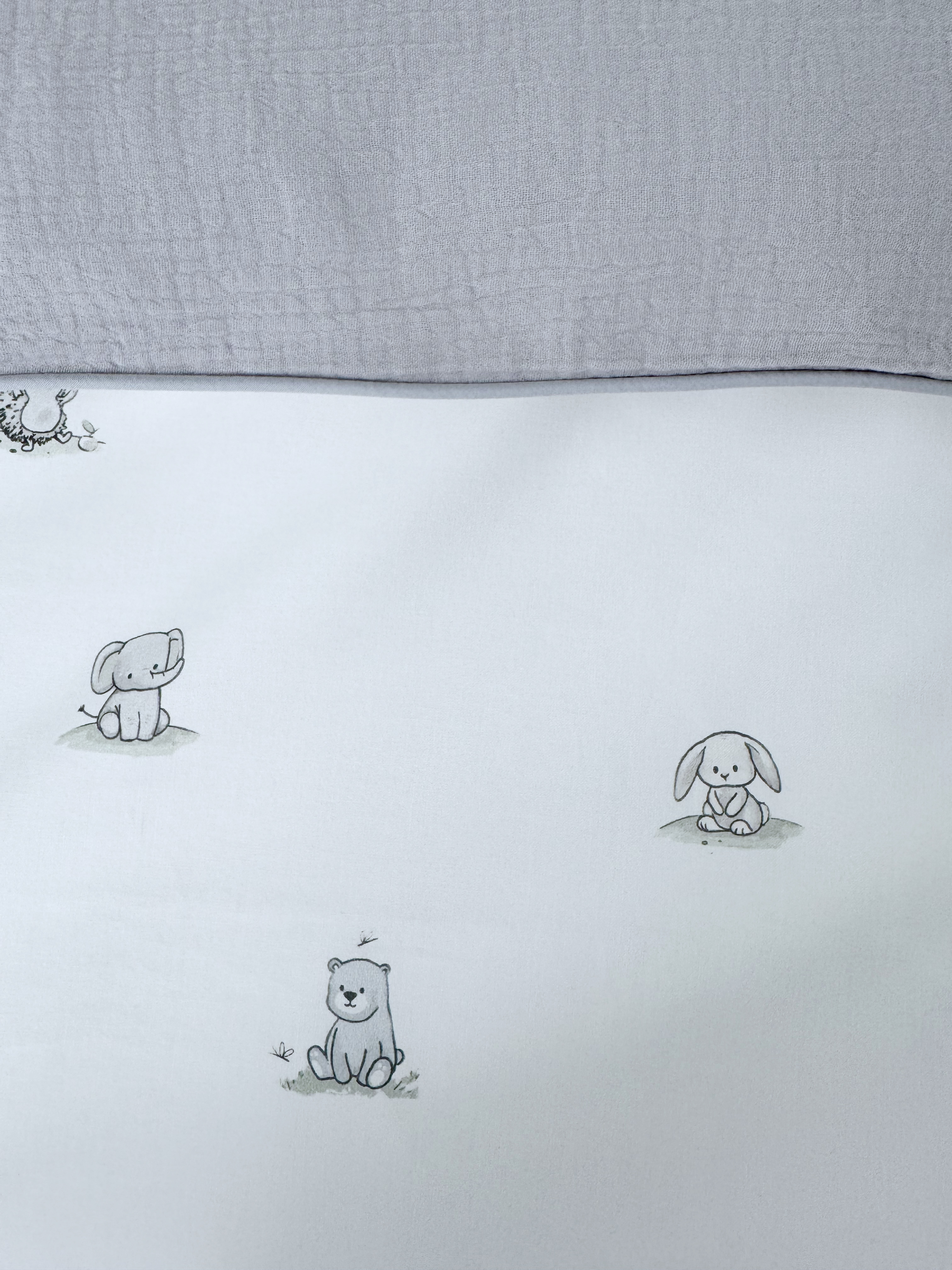 Комплект постельного белья New Animals, 6 предметов (125*65 пододеяльник+одеяло, наволочка+подушка, простыня на резинке, борт 30 см, 4 части), цвет белый/серый, Lepre