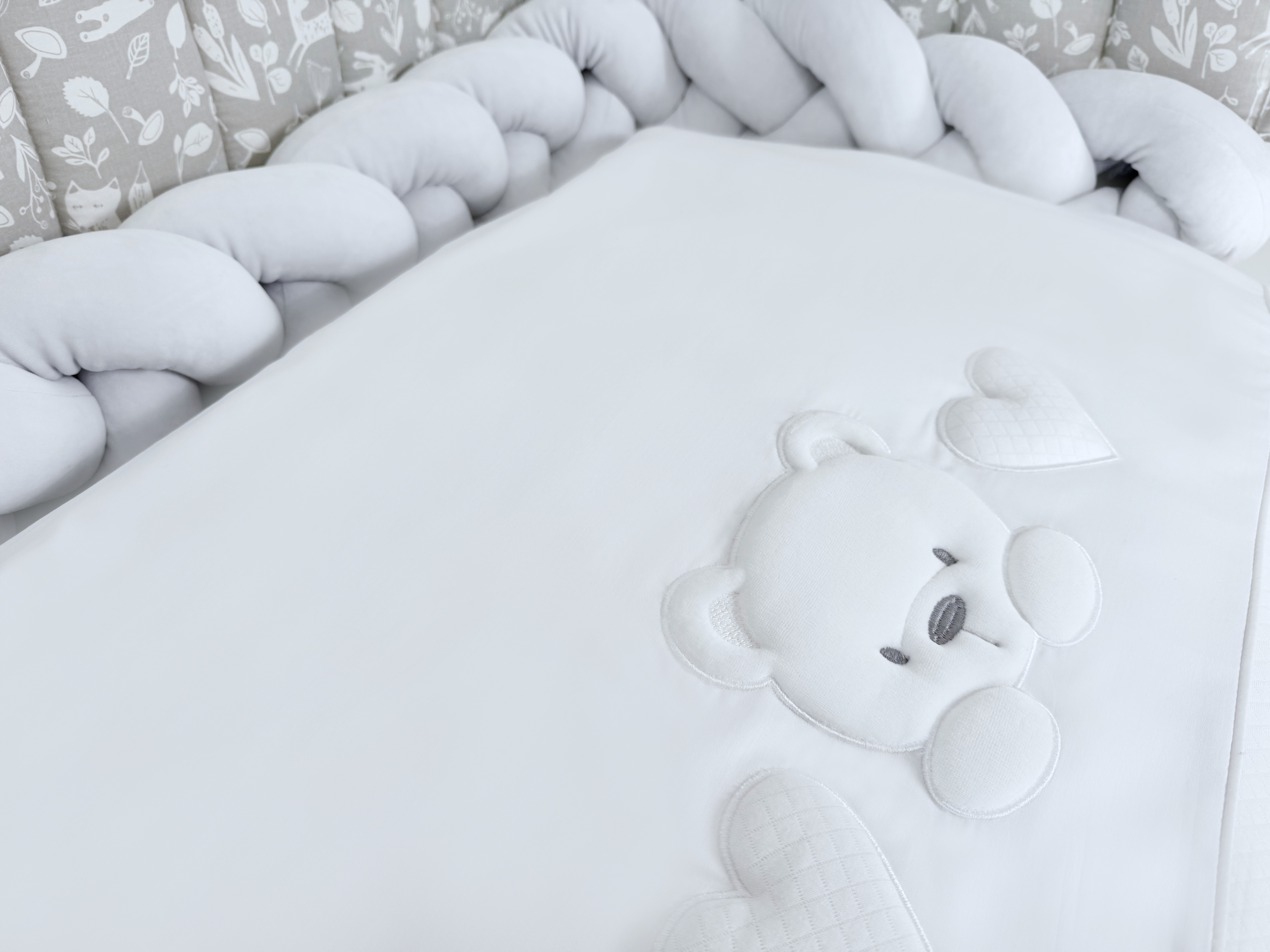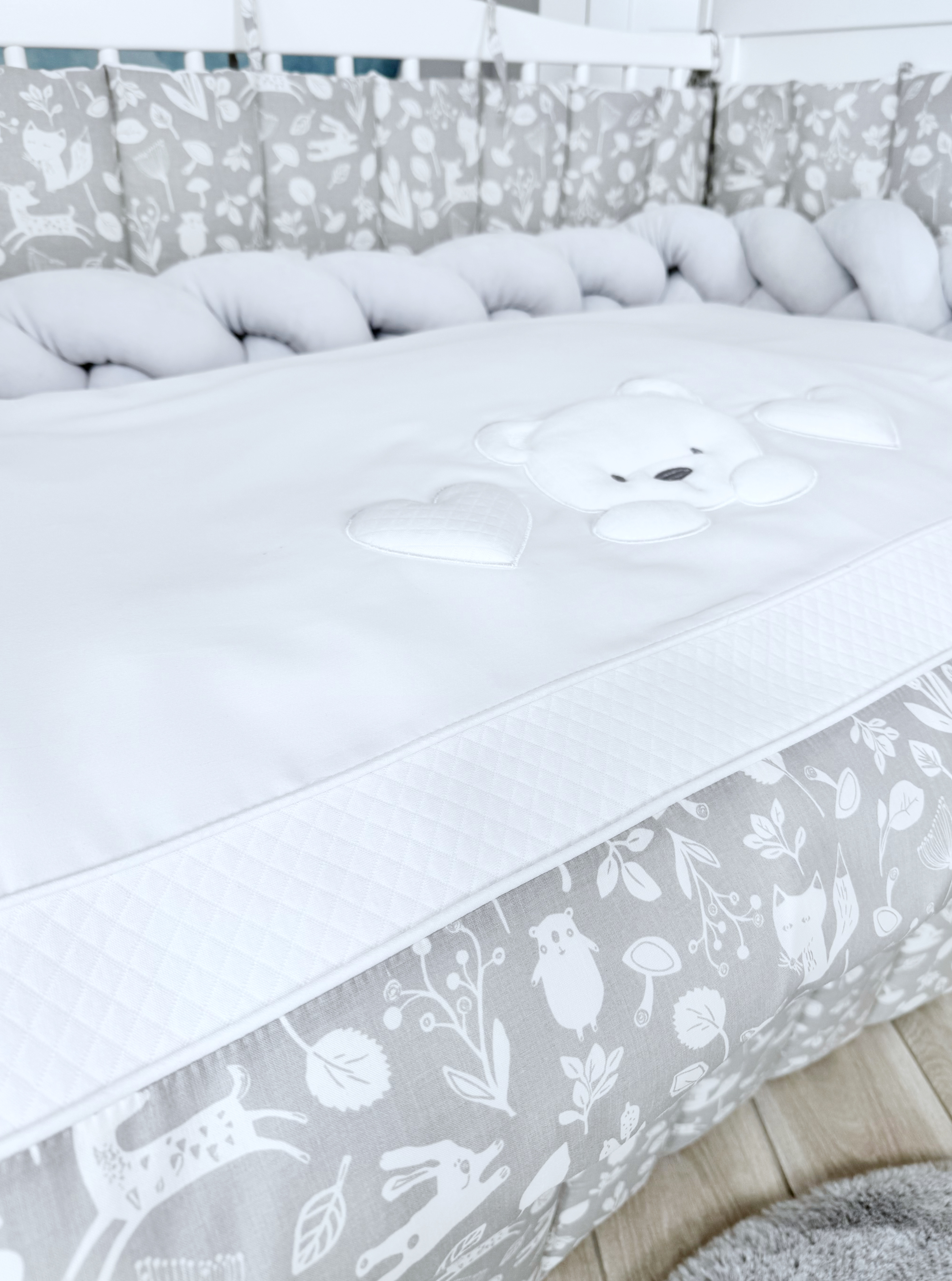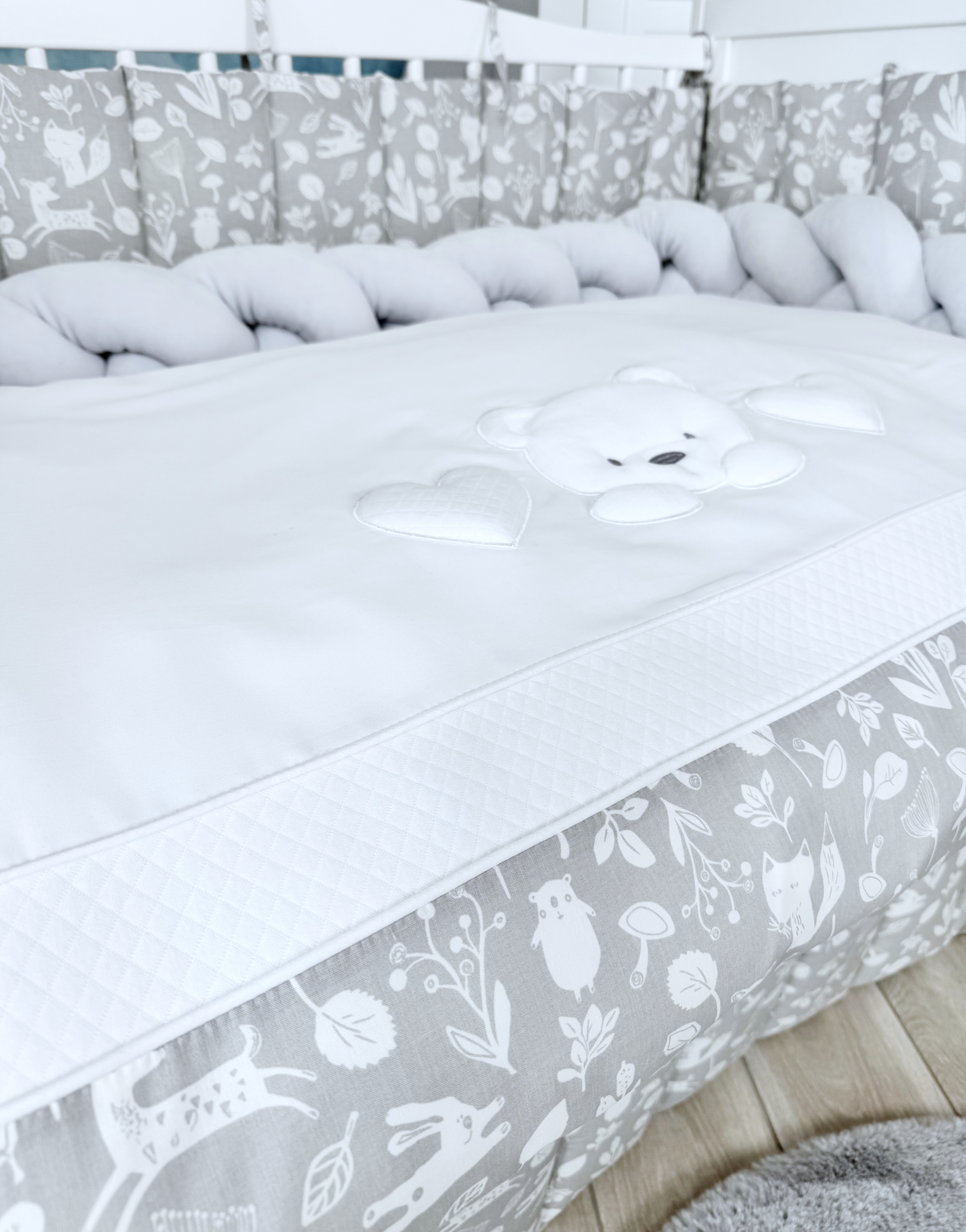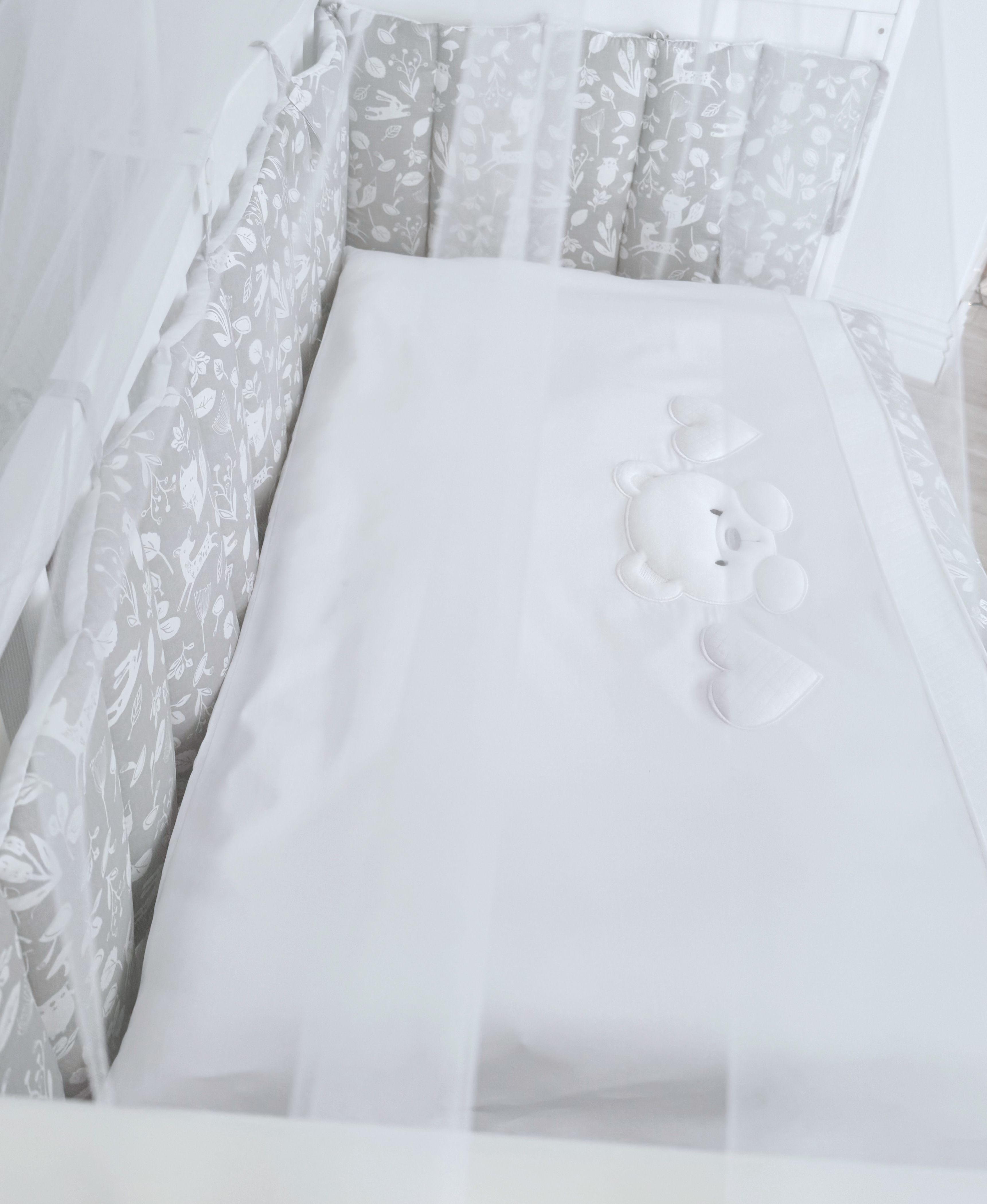 Комплект постельного белья New Teddy Bear, 6 предметов (125*65 пододеяльник+одеяло, наволочка+подушка, простыня на резинке, борт 30 см, 4 части), цвет серый/белый, Lepre