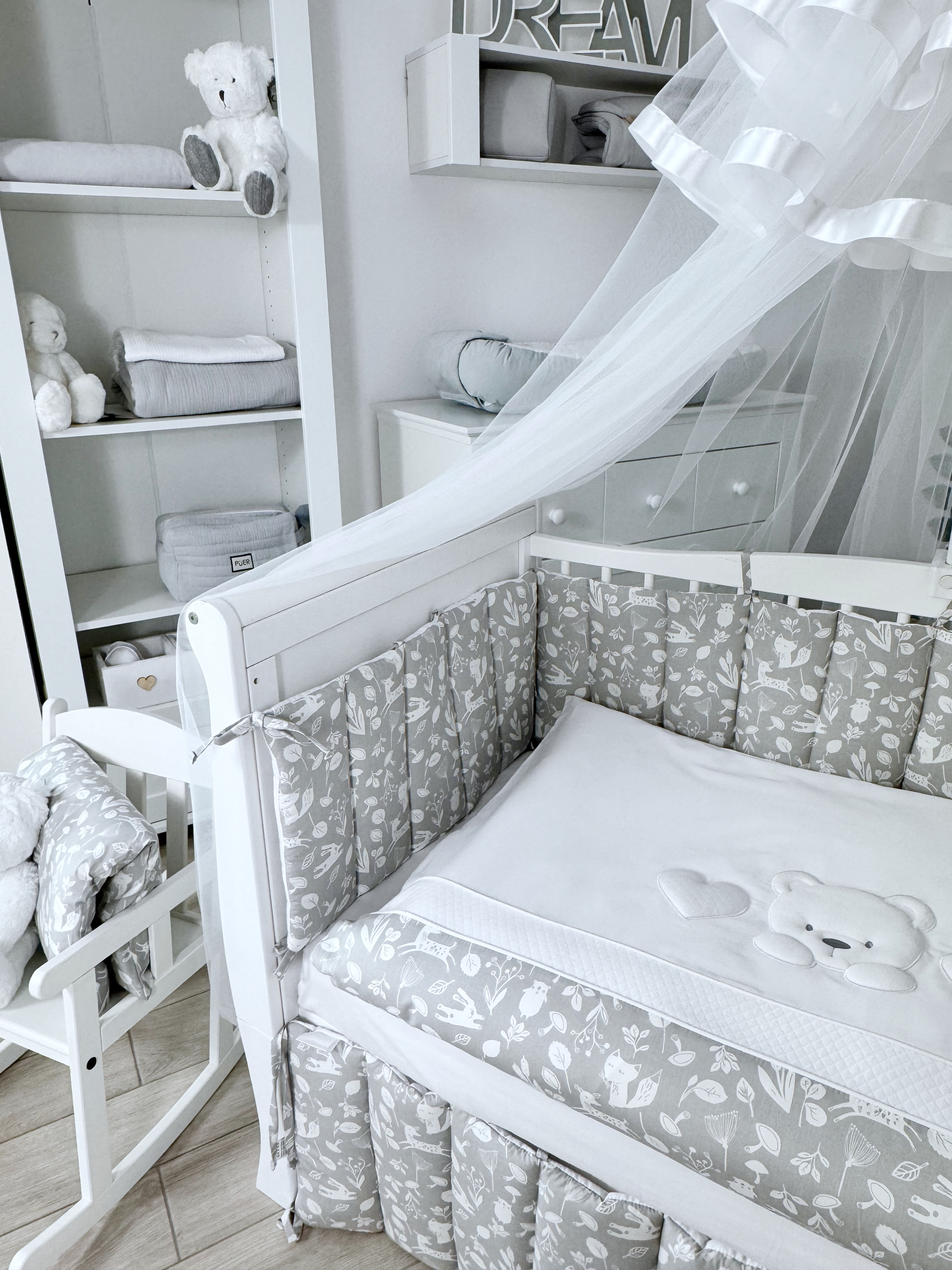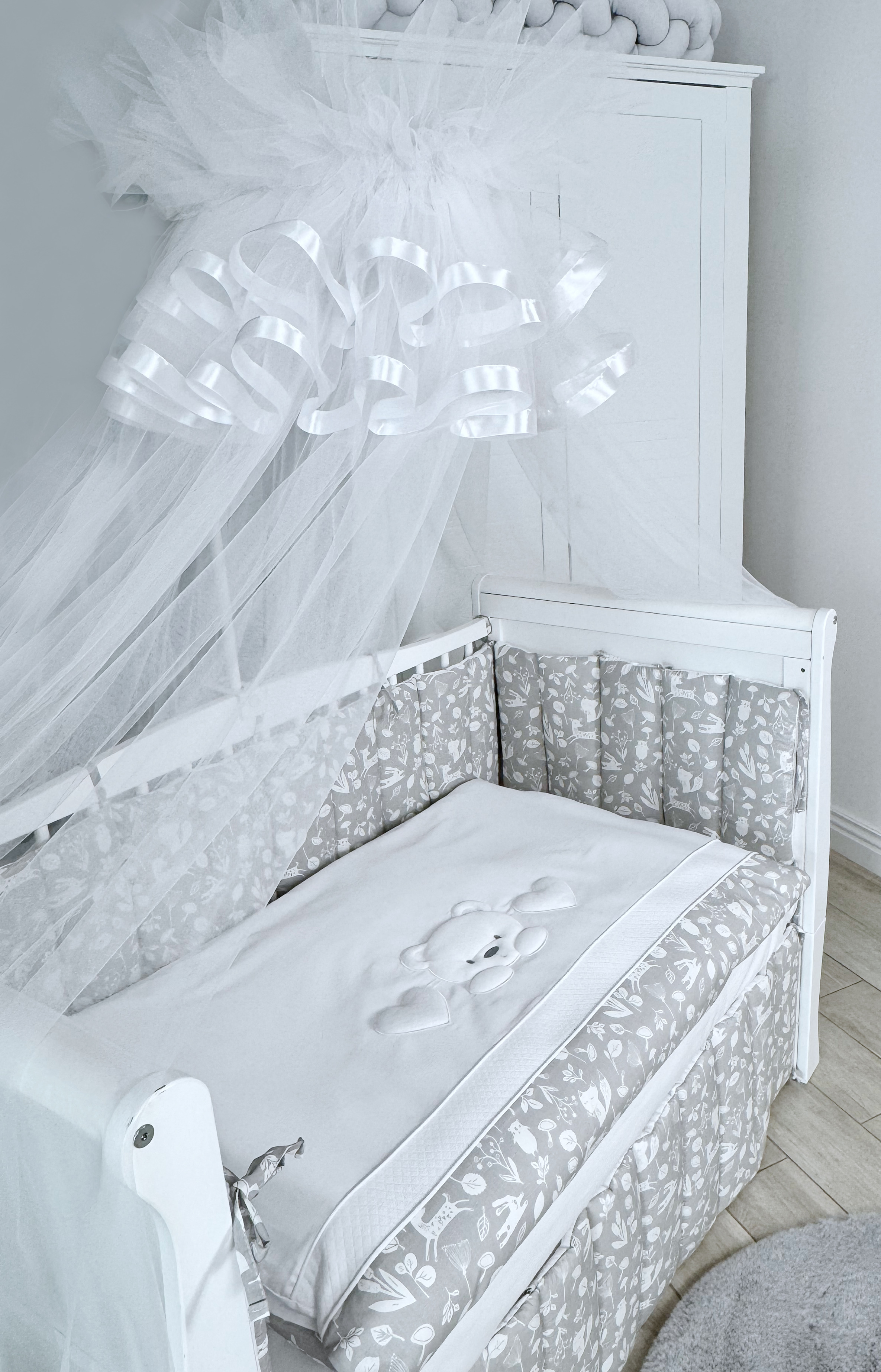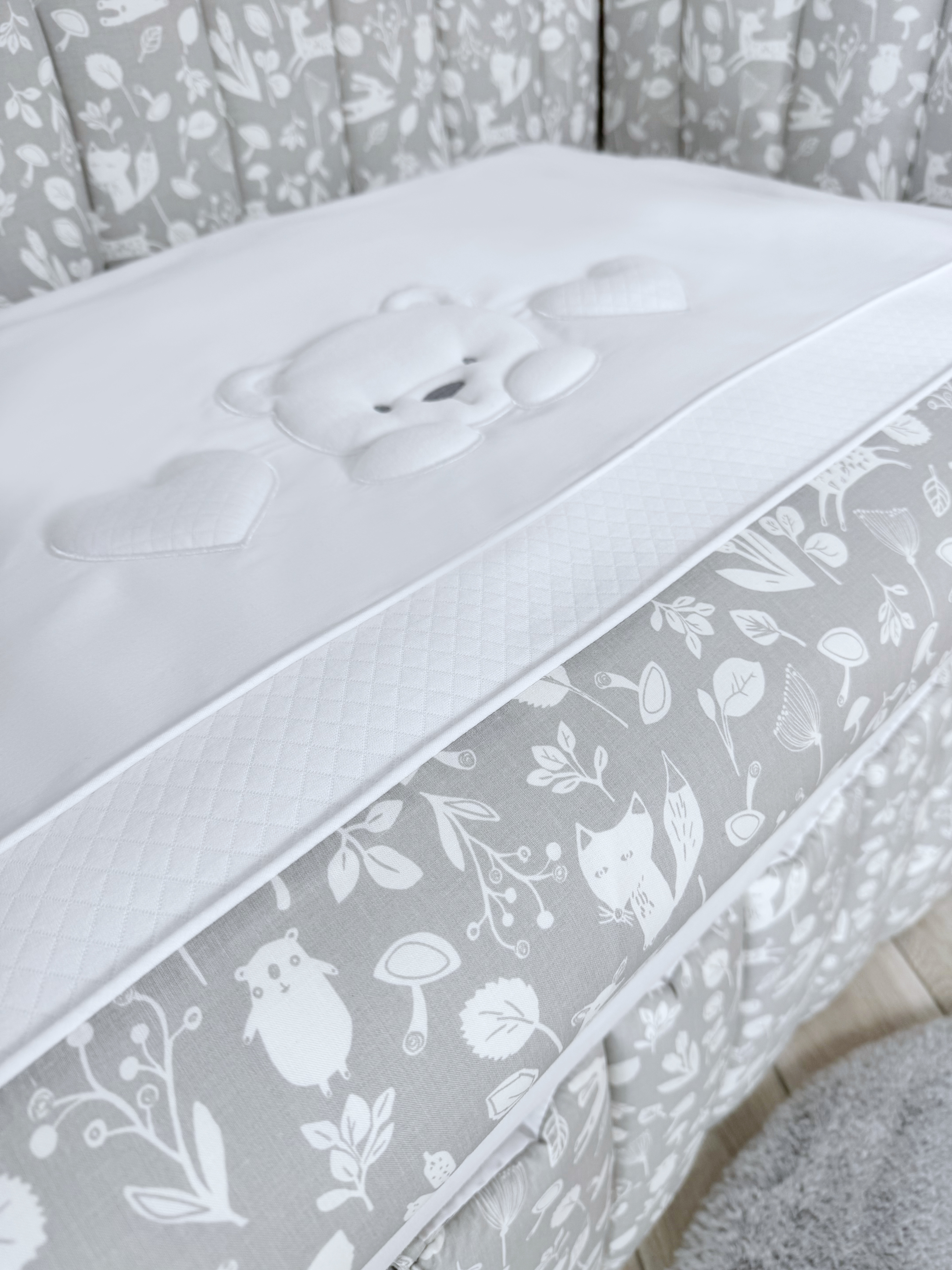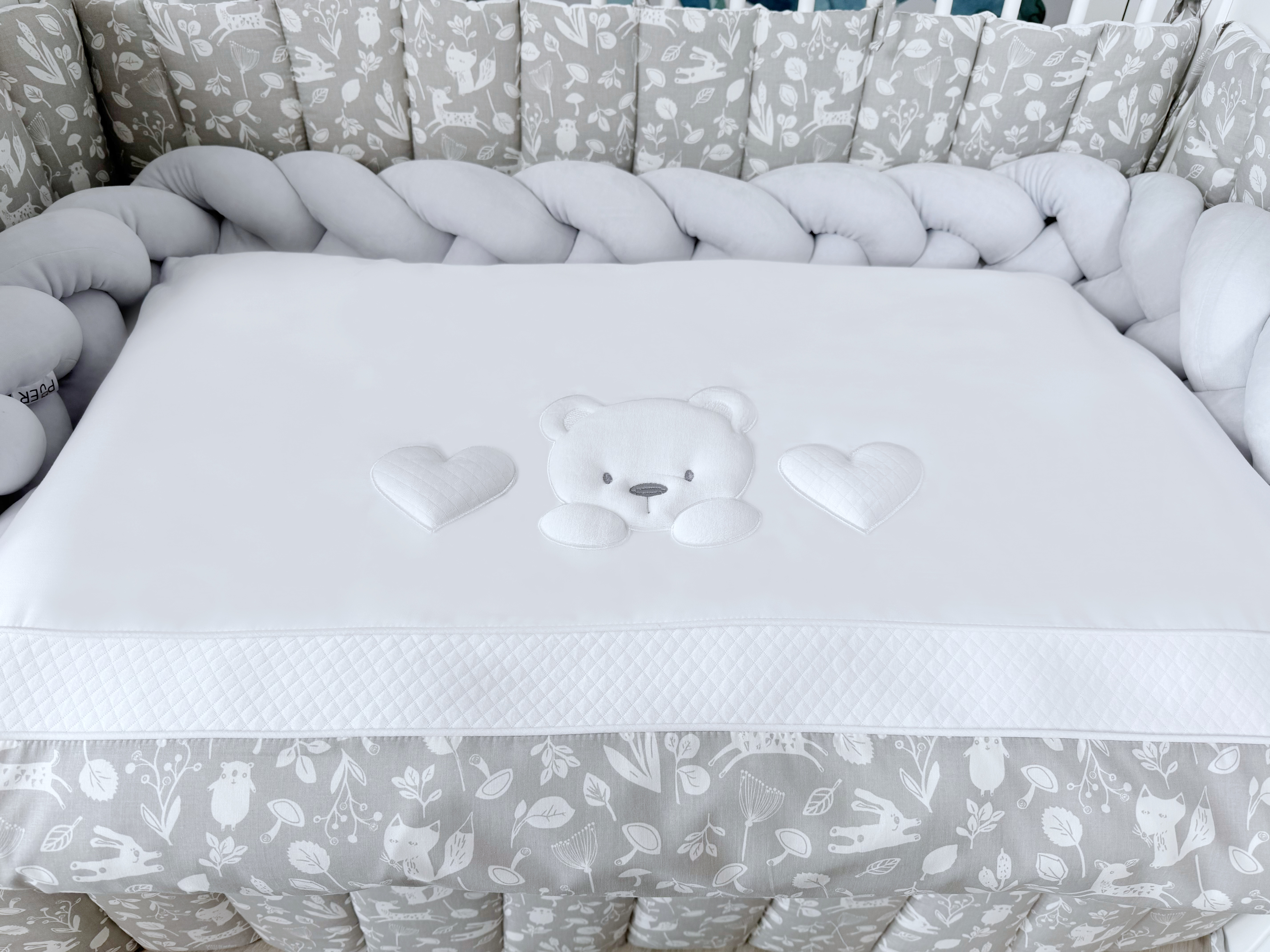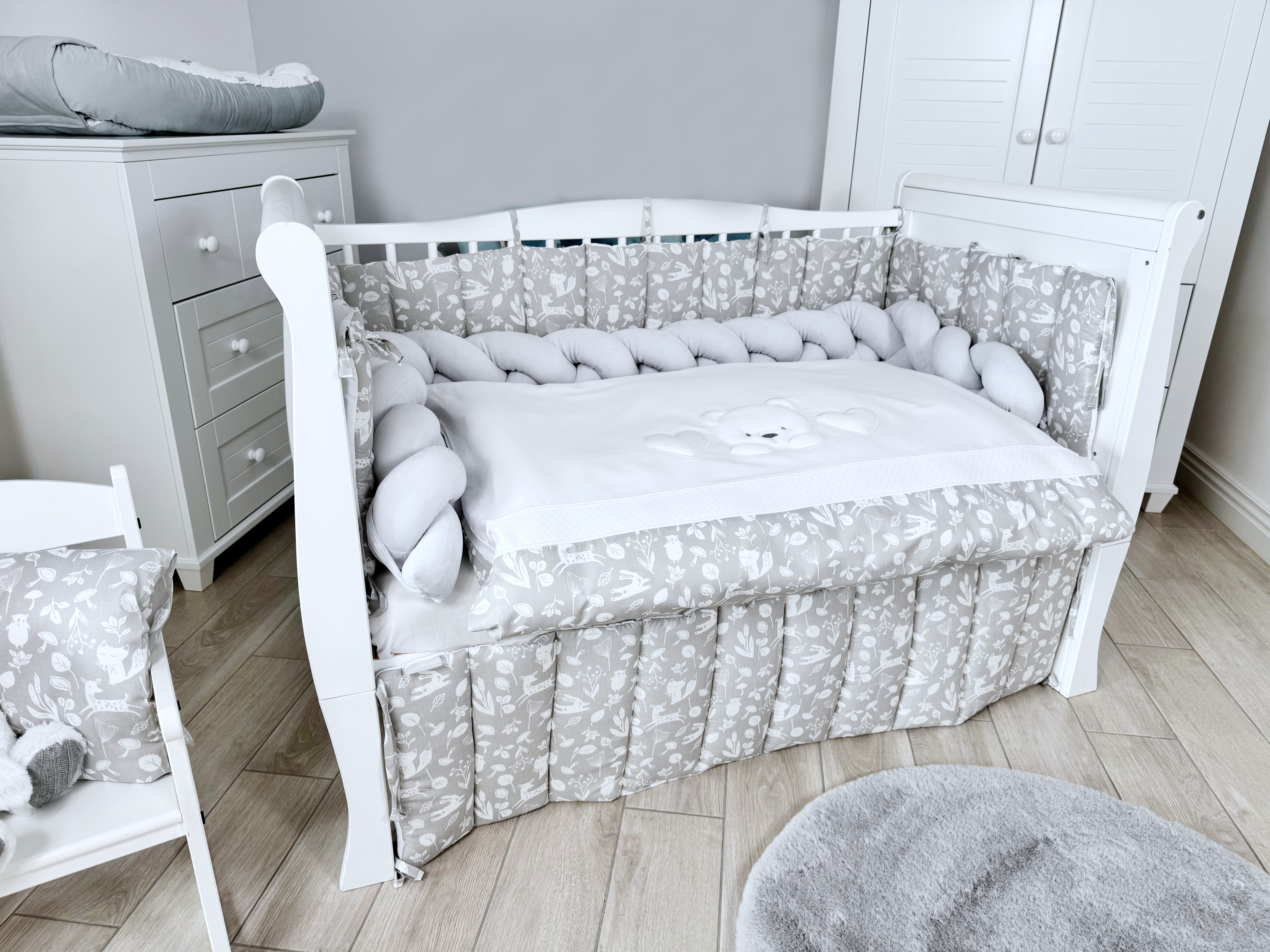 Комплект постельного белья New Teddy Bear, 6 предметов (125*65 пододеяльник+одеяло, наволочка+подушка, простыня на резинке, борт 30 см, 4 части), цвет серый/белый, Lepre