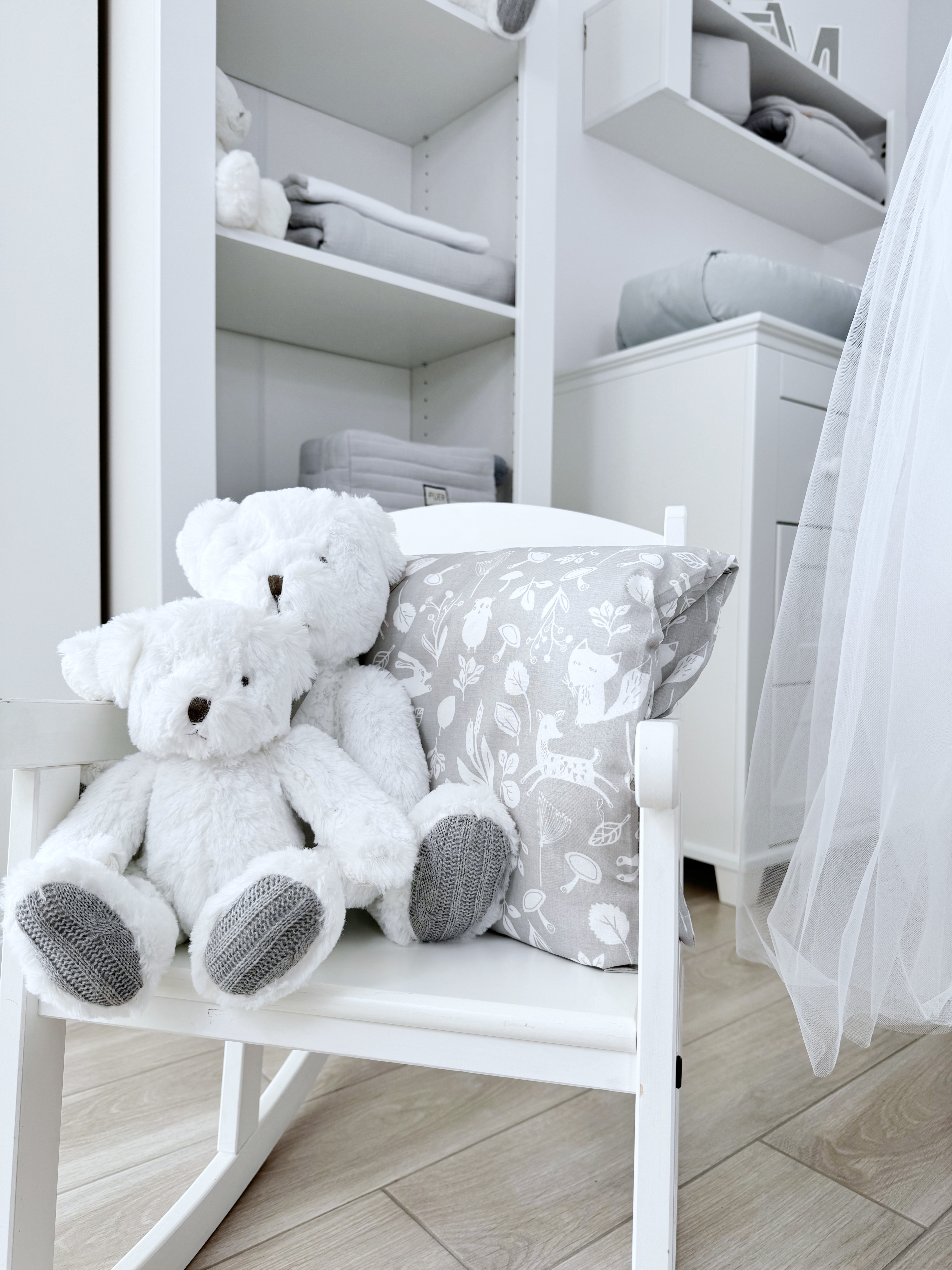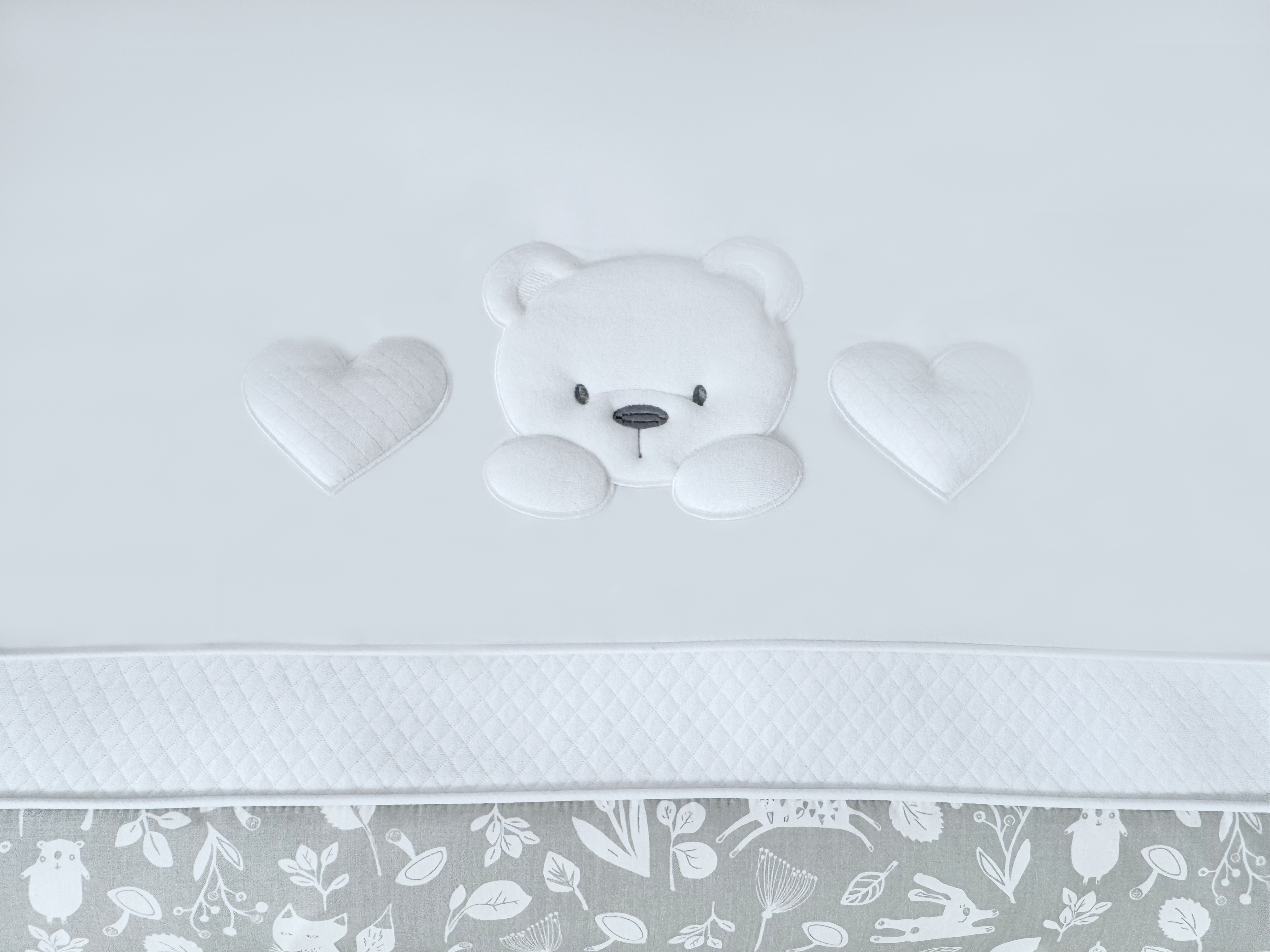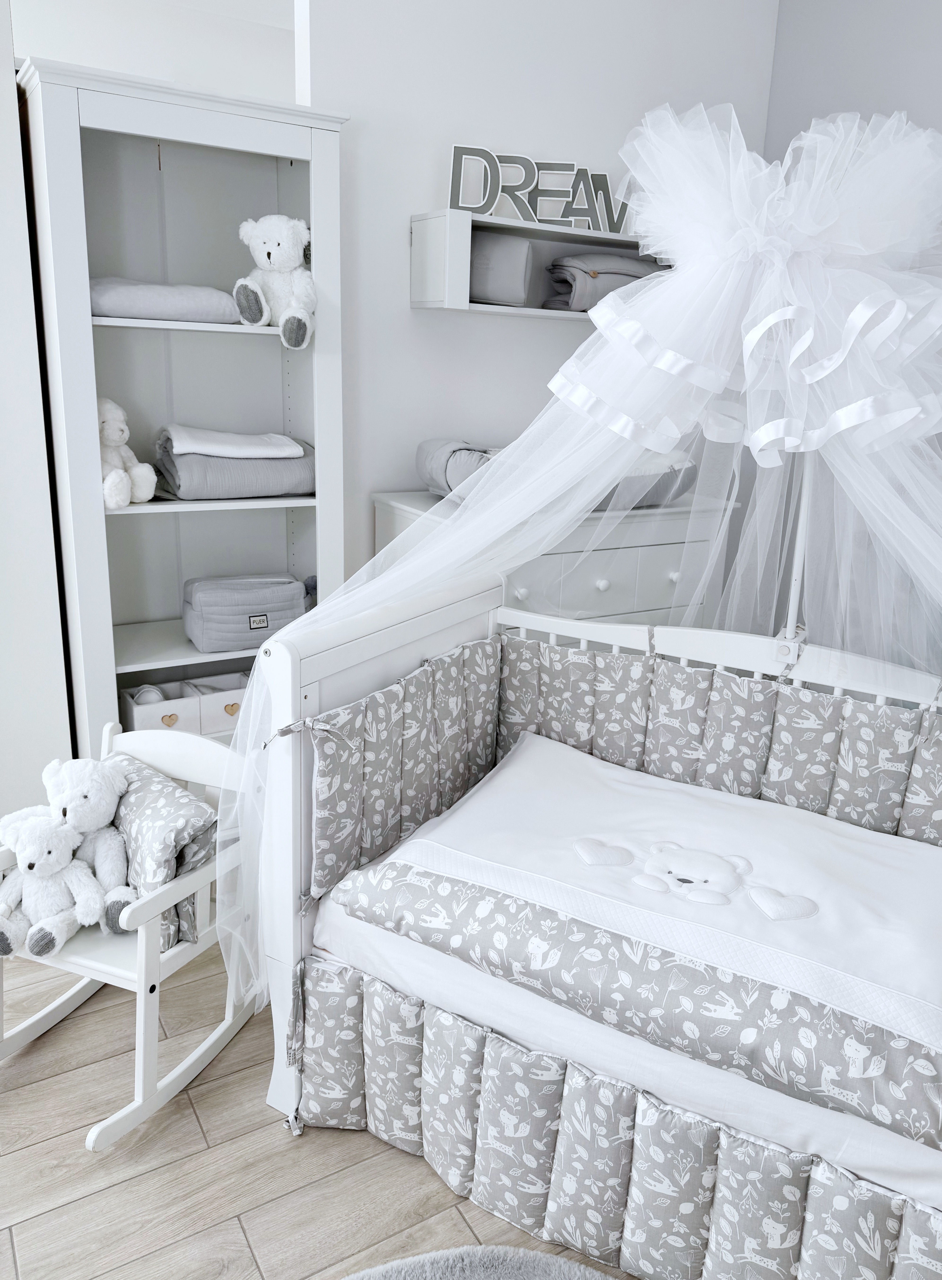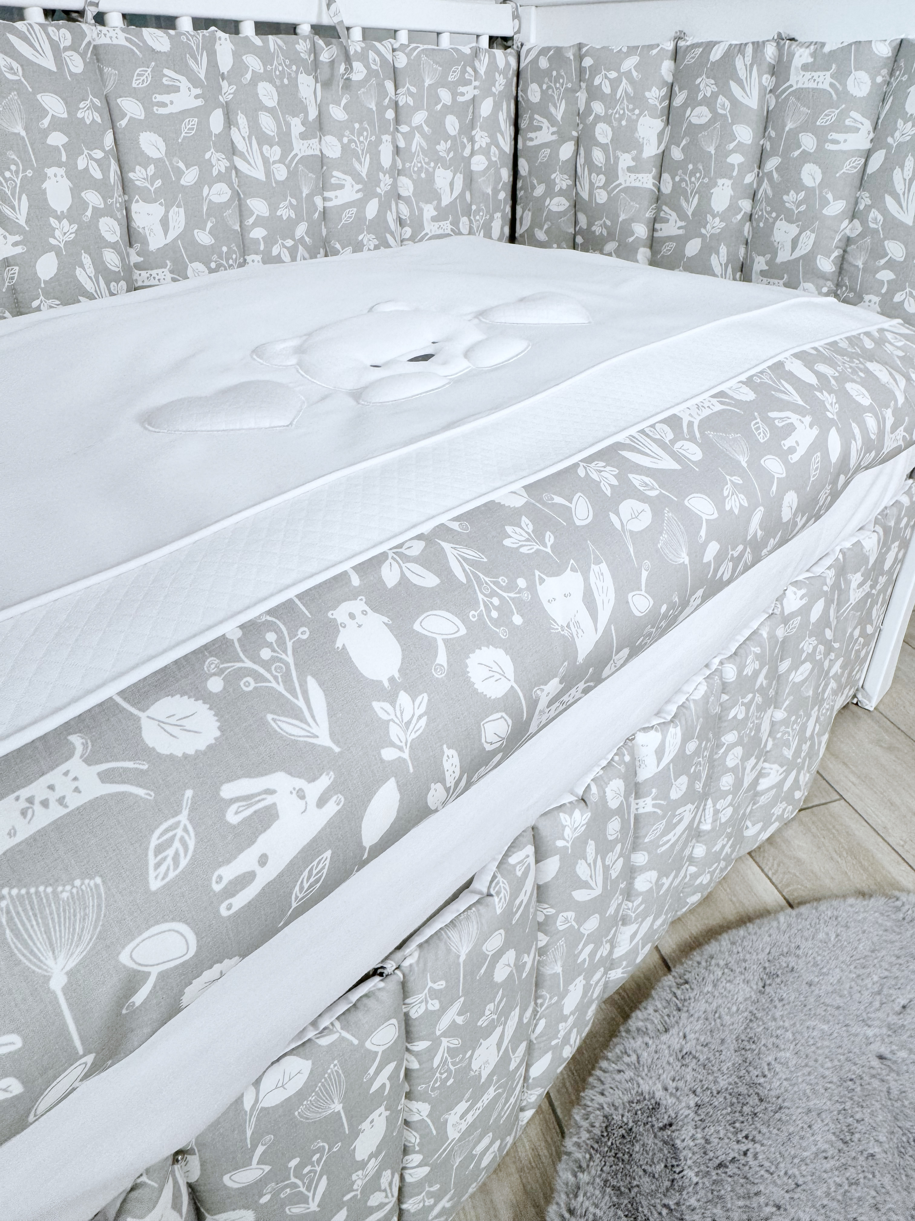 Комплект постельного белья New Teddy Bear, 6 предметов (125*65 пододеяльник+одеяло, наволочка+подушка, простыня на резинке, борт 30 см, 4 части), цвет серый/белый, Lepre