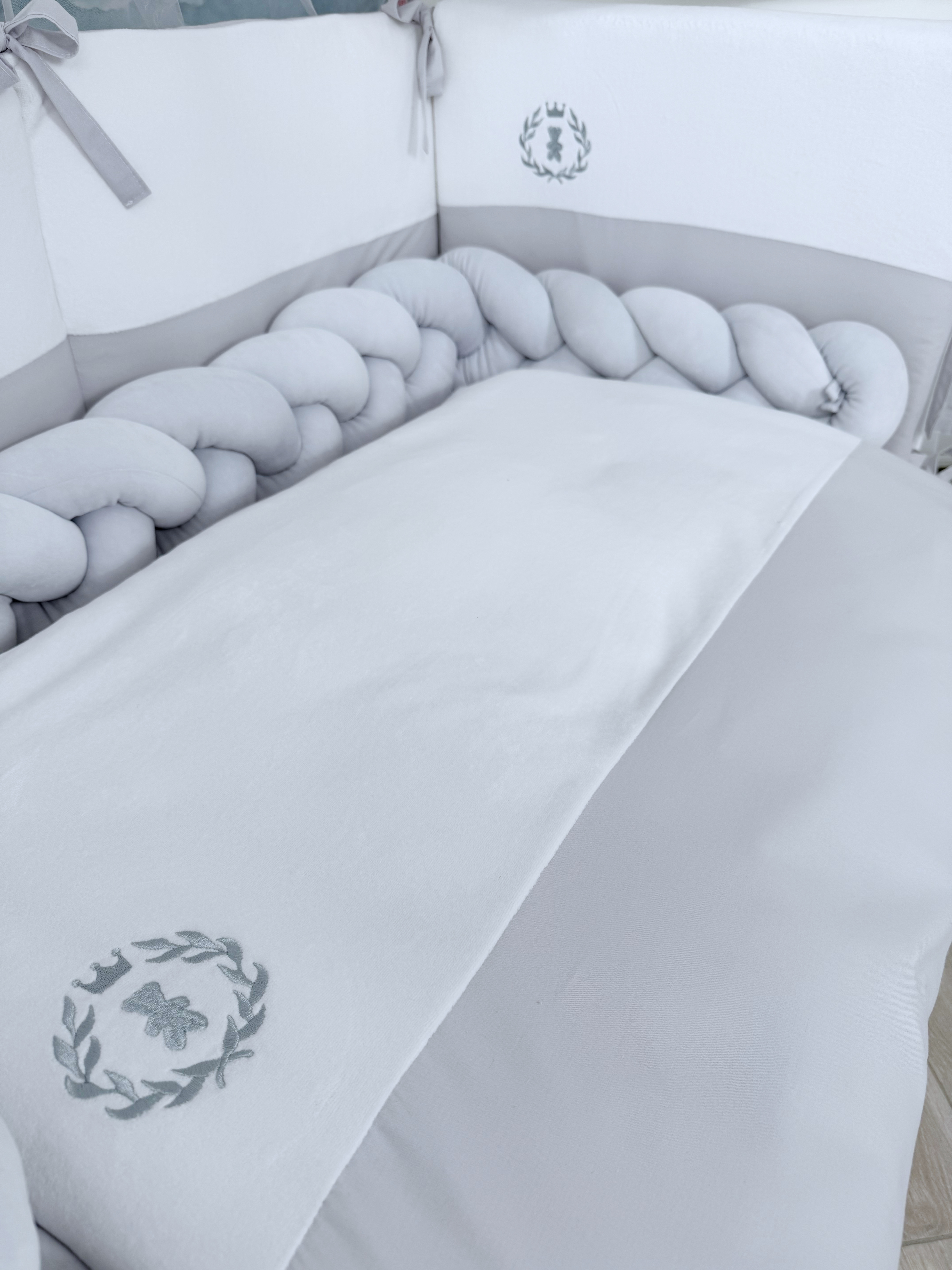 Комплект постельного белья New Velour Bear, 6 предметов (125*65 пододеяльник+одеяло, наволочка+подушка, простыня на резинке, борт 40 см), цвет серый, Lepre
